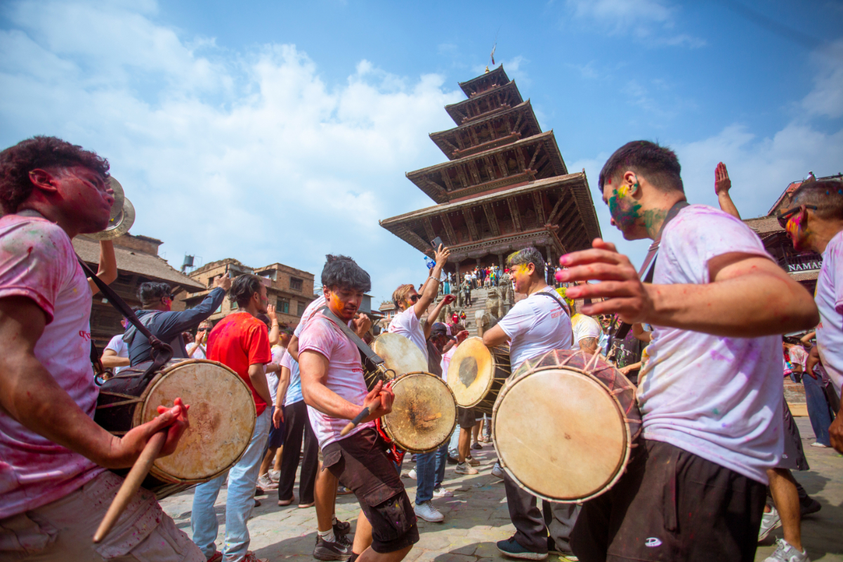 स्थानीय बाजा तथा परम्परागत धुनसँगै स्थानीय र आगन्तुक होलीमा रमाएका हुन् । भक्तपुर दरबार क्षेत्र वरिपरि घुम्न आएका विदेशी पर्यटकसमेत होलीमा रमाएका छन् ।