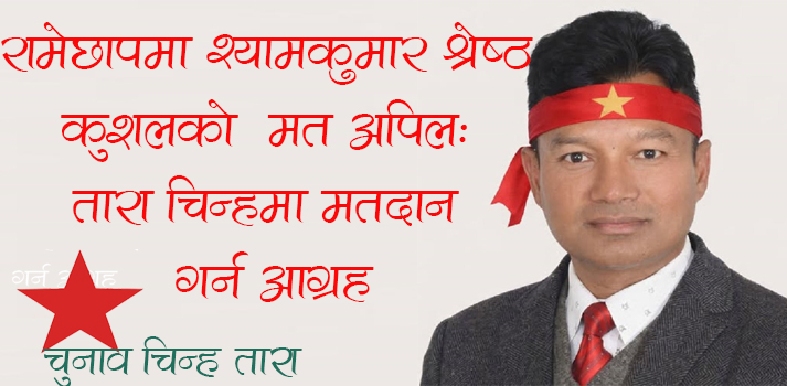 रामेछाप । प्रतिनिधिसभा निर्वाचन नजिकिँदै गर्दा श्याम कुमार श्रेष्ठ (कुशल) ले मतदातासँग पुनः समर्थनको अपिल गरेका छन्। सामाजिक सञ्जालमार्फत सार्वजनिक अप...