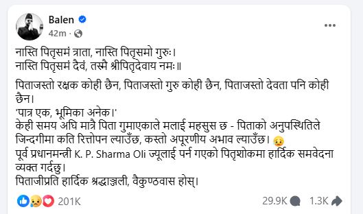 केही समयअघि पिता गुमाएका बालेनले फेसबुकमा लेखेका छन्– पिताजस्तो रक्षक कोही छैन, पिताजस्तो गुरु कोही छैन, पिताजस्तो देवता पनि कोही छैन। ‘पात्र एक, भूमिका अनेक।’