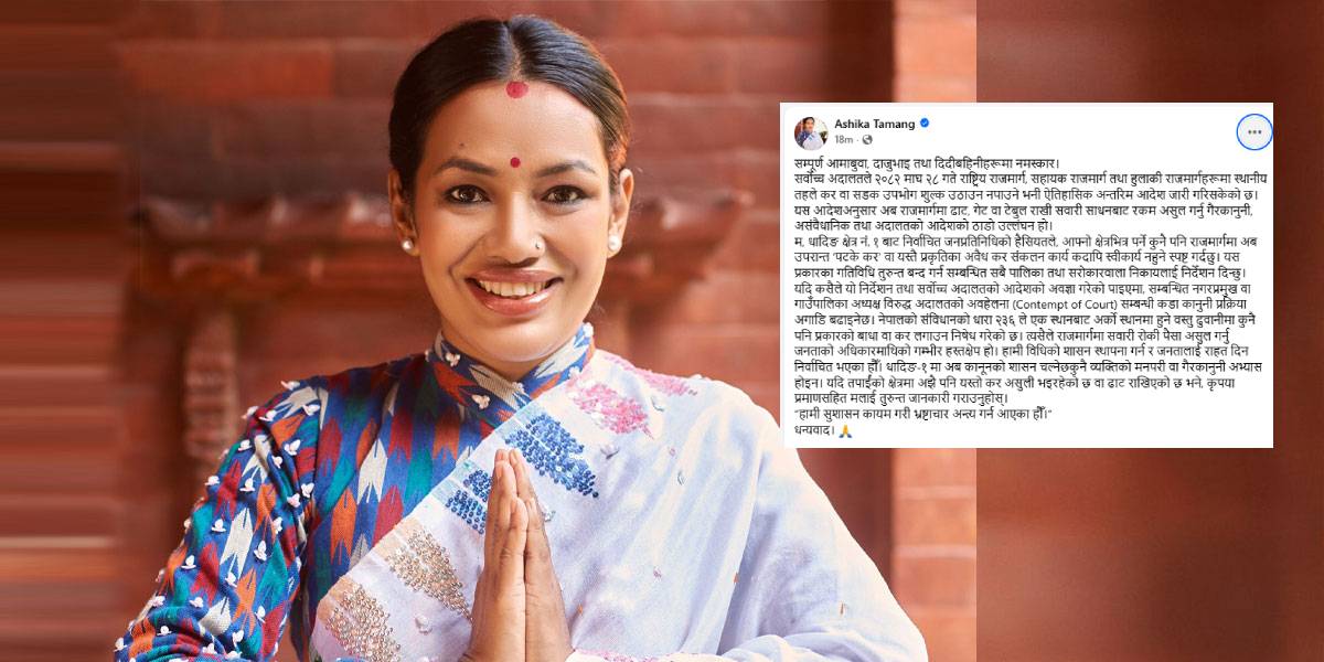 सांसद तामाङले सामाजिक सञ्जालमार्फत एक सार्वजनिक अपील जारी गर्दै सर्वोच्च अदालतले २०८२ माघ २८ गते राष्ट्रिय राजमार्ग, सहायक राजमार्ग तथा हुलाकी राजमार्गमा स्थानीय तहले कर उठाउन नपाउने गरी ऐतिहासिक अन्तरिम आदेश जारी गरिसकेको स्मरण गराएकी छन् ।