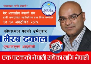 \"bhairabकाठमाडौं । गैरआवासीय नेपाली संघ अन्तराष्ट्रिय समन्वय परिषदको कोषाध्यक्षमा अष्ट्रेलियाबाट भैरब ढकालले आफ्नो उम्मेदवारी घोषणा गरेका छन् । एनआरएनए अष्ट्रेलियाका पुर्व उपाध्यक्ष तथा एनआरएनए आईसीसी सदस्य ढकालले एक पत्रकार सम्मेलन गर्दै घोषणा पत्र सहित आफ्नो उम्मेदवारी सार्वजनिक गरेका हुन । एनआरएनएलाई बिगतका दिनदेखि सघाउँदै आएका ढकालले एनआरएनए आइसीसीको पूर्व घोषित योजना अनुसार भूकम्प पीडितलाई एकहजार घर निर्माण कार्यमा सघाउने तथा काठमाडांैको बालुवाटारमा संघको आफ्नै भवन निर्माणका लागि महत्वपूर्ण भूमिका निर्वाह गर्ने आफ्नो घोषणापत्रमा उल्लेख गरेका छन् । ढकालले ठूला परियोजनामा मात्रै नभएर साना–साना पूँजी भएका गैरआवासीय नेपालीहरुलाई पनि समेटेर उनीहरुलाई सुहाउँदो परियोजनामा सामूहिक लगानीको वातावरण सिर्जना गर्ने समेत प्रतिवद्धता जनाएका छन् । संघको कोष पारदर्शी राख्दै यसलाई वैज्ञानिक तथा प्रभावकारी ढंगले चलाउने ज्ञान, सीप, अनुभव र योग्यता आफूसँग भएकाले तथा संघलाई आर्थिक समृद्धितिर अगाडि बढाउन तयार रहेर आफूलाई उम्मेदवारका रुपमा अगाडि सारेको उनले बताएका छन् । लामो समयदेखि गैरआवासीय नेपाली संघको कुनै न कुनै जिम्मेवारीमा रही आफूलाई क्रियाशिल गराउँदै आएका ढकालले कोषाध्यक्ष पदमा आफूले दिएको उम्मेदवारीप्रति सहयोग गर्न अपिल समेत गरेका छन् ।
