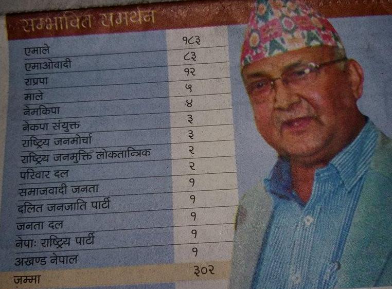 \"Oliiiiiiiiii\"काठमाडौं । नेपाली कांग्रेस र यसका सभापति सुशील कोइराला एमाले अध्यक्ष केपी ओलीलाई समर्थन दिन तयार नरहेको स्पष्ट भएपछि एमाले कांग्रेसबिनै संसद्मा बहुमत हासिल गर्ने तयारीमा जुटेका छन्।   आजको अन्नपूर्ण पोष्ट दैनिकमा खबर छ यद्यपि अन्तिम समयसम्म पनि कांग्रेस, एमाओवादीलगायत धेरै दलसँग मिलेर सरकार बनाउने पक्षमा एमाले रहेको एक नेताले बताए । विगतमा भएको ‘भद्र सहमति’ मा कांग्रेसको स्पष्ट धारणा नआएपछि एमालेले हरेक विकल्पमा सरकार गठनको गृहकार्य सुरु गरेको हो। एमाले अध्यक्ष ओलीलाई रोक्न बाह्य शक्ति लागेको भन्दै त्यसलाई विफल पार्न साना दलसमेत सकारात्मक भएपछि एमाले उत्साहित भएको ती नेताले बताए । सरकार बनाउन एमाओवादीले साथ दिने भएपछि एमालेका शीर्ष नेता अनौपचारिक रूपमा दलहरूसँग छलफलमा जुटेका छन्। एमाओवादीको बिहीबार बस्ने पदाधिकारी बैठकले यस सम्बन्धमा औपचारिक निर्णय गर्ने भएको छ। एमाले केन्द्रीय सदस्य एवं प्रचार विभागका उपप्रमुख सूर्य थापाले मंगलबार अध्यक्ष ओलीले विभिन्न साना दलका नेतासँग यसबारे छलफल गरेको जानकारी दिए। उनले कांग्रेससहित धेरैभन्दा धेरै दल मिलेर सरकार बनाउँदा अहिलेको समस्यासँग जुध्न सकिने भएकाले यसलाई नै एमालेले प्राथमिकतामा राखेको पनि बताए । त्यसो भएन भने पनि कांग्रेसबाहेक अन्य दलको समर्थनमा बहुमत पुग्ने उनको भनाइ थियो। अहिले संसद्बाट बहुमतीय आधारमा प्रधानमन्त्री बन्न तीन सय मत आवश्यक पर्छ । संसद्मा रहेका पाँच सय ९८ सभासद्को सामान्य बहुमत पुर्‍याउन यो संख्या आवश्यक परेको हो। अहिले एमालेसँग एक सय ८३ र एमाओवादीसँग ८३ सभासद् छन्। यी दुई पार्टीका सभासद् संख्या जोड्दा दुई सय ६६ हुन्छ। एमालेका एक नेताका अनुसार राप्रपा, माले, नेमकिपा, नेकपा संयुक्तले समेत ओलीलाई समर्थन गर्ने जनाउ दिएका छन्।हालै राप्रपा विभाजित भएपछि त्यसका दुवै पक्षले ओलीलाई समर्थन गर्ने कि नगर्ने भन्ने निर्णय गरिसकेको छैन। राप्रपा अध्यक्ष पशुपतिशमशेर राणाले भने ओलीलाई समर्थन गर्ने भनाइ सार्वजनिक गरिसकेका छन् । राणा पक्षका केन्द्रीय सदस्य राजेश गिरीले कांग्रेसको गठबन्धन भएमा भने आफ्नो पार्टीको समर्थन हुन नसक्ने बताए। उनले विगतमा आफ्नो पार्टीसँग भएको सहमति कांग्रेसले पालना नगरेकाले एमाले नेता ओलीलाई समर्थन हुने बताए।चन्द पक्षले पनि ओलीलाई नै समर्थन गर्ने संकेत गरेको छ। चन्द पक्षका नेता डा। प्रकाशचन्द्र लोहनीले यस बेला सबै दल मिलेर सरकार बनाएमा संकटको सामना गर्न सकिने बताए। उनले पनि यस विषयमा कुनै औपचारिक निर्णय नभएको जानकारी दिए। राप्रपा, माले, नेमकिपा र नेकपा संयुक्तका गरी २४ जना सभासद् छन्। त्यस्तै राष्ट्रिय जनमोर्चा, जनमुक्ति लोकतान