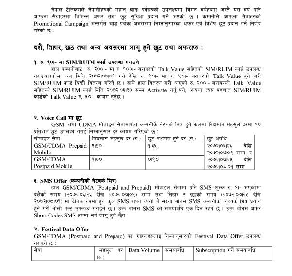 काठमाडाैं । नेपाल टेलिकमले विगत वर्षहरुमा जस्तै यस वर्ष पनि आफ्ना सेवाहरुमा विभिन्न अफर तथा छुट सुविधा प्रदान गर्ने भएको छ । दशैं, तिहार, छठका लागि छुट र अफरहरु ल्याएको हाे ।