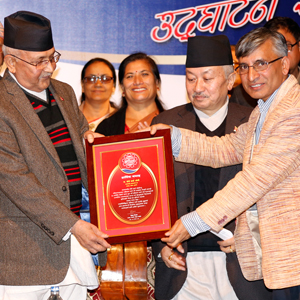 नेपाल ट्रेड युनियन महासङ्घ (जिफन्ट)ले आयोजना गरेको राष्ट्रिय महाधिवेशनबाट प्रधानमन्त्री केपी शर्मा ओलीलाई सम्मान गरिँदै । तस्बिरः रोशन सापकोटा, रासस \"oli_samman\"