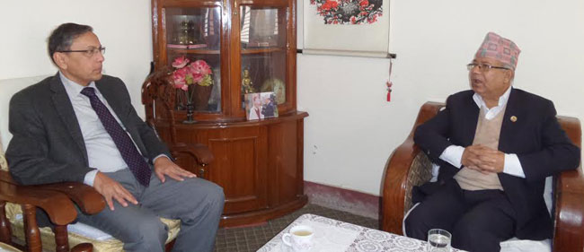 \"Ranjeet-Ray-Meets-Madhab-Ne\"काठमाडौं । भारतीय राजदूत रणजित रायले मधेसी मोर्चाको आन्दोलनमा भारतको समर्थन नरहेको बताएका छन् । एमाले नेता माधवकुमार नेपाललाई उनकै निवास कोटेश्वरमा भेटेर भारतीय राजदूत रन्जित रायले भारतले नाकाबन्दी नगरेको र मधेसी मोचाको आन्दोलनलाई समर्थन पनि नगरेको बताएका हुन् ।