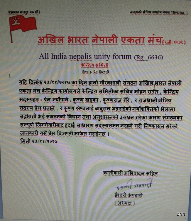 काठमाडौं । आखिल भारत नेपाली एकता मञ्चले बाबुरामको नयाँ शक्तिमा लागेको भन्दै आफ्ना केही सदस्याहरुलाई संगठनबाट निश्कासन गरेको छ । अखिल भारत नेपाली एकता मञ्चका केन्द्रिय सचिव मोहन राउत,  केन्द्रिय सदस्यहरु प्रेम न्यौपाने , कृष्ण खड्का , कृष्णराज गैरे , राजधानी क्षेत्रिय सदस्य प्रेम घताने र कृष्ण श्रेष्ठलाई बाबुराम भट्टराईको नयाँशक्तिको भेलामा सहभागी भएको भन्दै निष्काशन गरेको घोषण गरेको हो । मञ्चका अध्यक्ष इश्वरी भणडारीले एक विज्ञप्ती जारी गर्दै संगठनको विधान तथा अनुशासनको उलंघन गरेका कारण संगठनका सम्पुर्ण जिम्मेवारीबाट हटाई साधारण सदस्यसम्म नरहने गरी उनीहरुलाई निश्कासन गरेको \"bigapti\"घोषणा गरेको छ ।