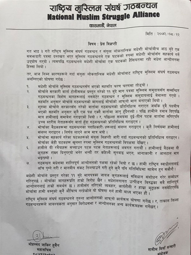 काठमाडौं । संयुक्त लोकतान्त्रिक मधेसी मोर्चामा आबद्ध राष्ट्रिय मुस्लिम संघर्ष गठबन्धन मोर्चा बाट अलग्गिएको छ । राष्ट्रिय स्वाधिनतामा आँच आउने गतिविधि मोर्चाले गरेको भन्दै उसले अलग्गिएको घोषणा गरेको हो । मंगलबार बिहान काठमाडौंमा पत्रकार सम्मेलन गरी गठबन्धन संयोजक तथा तमलोपाका केन्द्रीय सदस्य शमिम मियाँ अन्सारीले मधेसी मोर्चाले मुस्लिम गठबन्धन सँग गरेको सहमति चरण चरणमा तोडेको बताउँदै अब सँगै बस्न नसक्ने बताए । अव देखी मुस्लिम गठबन्धनले छुट्टै आन्दोलन गर्ने  पनि उनले बताए । गठबन्धन संयोजक अन्सारी र महासचिव मोहम्मद जाकिर हुसैनले एक विज्ञप्ति जारी गर्दै आफूहरुका मुद्दामा मधेसी मोर्चाले छलफल नै नगरी निर्णय लाद्ने काम गरेको बताएका छन् । गठबन्धनले आफुहरुको मुद्धा मोर्चाले नसमेटेको र आफुसँग मोर्चाको व्यावहार र कार्यशैली गलत भएको कारण सँगै बस्न नसकिने बताउँदै अलग्गिने घोषणा गरेको बताएका छन् । उनीहरुले मधेसी नेताहरुको दिल्ली भ्रमण गलत भएको भन्दै विरोध जनाएका छन् । \"Press-Relese-of-National-Mu\"
