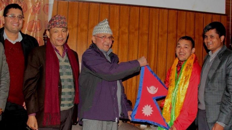 \"sanjayaकाठमाडाैं । बिश्व पर्वतारोही एबम लामो दूरीका धाबक संजय पण्डितलाई अफ्रीका महादेशकै छानो भनेर चिनिने किलिमन्जारो उल्टो हिडेर आरोहणको लागि प्रधामन्त्री केपी शर्मा ओलीले राष्ट्रिय झन्डा प्रदान गरेका छन् । शनिबार विहान बालुवाटरमा प्रधामन्त्री ओलीले पण्डितलाई नेपालको राष्ट्रिय झन्डा एबम खादा लगाएर बिदाई गरेका हुन् । सात महादेशका सर्बोच्च शिखरहरुको आरोहणको तयारीमा रहेका पण्डितको अन्तिम गन्तब्य अन्टार्टिकाको बिन्सोन मशिफ रहेको छ । सगरमाथा, प्राण घातक हिमाल भनेर चिनिने मनास्लु ,जापानको सर्बोच्च शिखर फुजी, युरोप, अमेरिका, अस्ट्रेलिया लगायत महादेशको सफल कृतिमानी आरोहण गरिसकेका छन् । पण्डितले गत वर्ष किलिमन्जारो ६ घण्टा १३ मिनेटमा आरोहण गर्दै दक्षिण एसियाकै तीब्र आरोहीको रुपमा कृतिमान कायम गरेका थिए । उनले अस्ट्रेलियाको सर्बोच्च शिखर कोजियस्कोमा गतवर्ष उल्टो हिडेर सफलतापुर्बक आरोहण गरिसकेका छन् भने उनले यूरोपको सर्बोच्च शिखरमा ६ मिनेट अर्धनग्न भइ अन्तर्रास्ट्रिय कृतिमान गरे भने जापानको फुजी र अमेरिकाको सर्बोच्च शिखरहरुमा नेपाली पोशाकमा राष्ट्रिय गीत गाएर कृतिमानी आरोहण गरेका थिए । विदाइ कार्यक्रममा प्रधामन्त्री ओलीले संजयको अन्तिम गन्तब्य बिन्सोन मशिफ चुम्ने सपनामा आफूले सरकारी स्तरबाट उचित सहयोग गर्ने प्रतिवद्धता जनाए ।