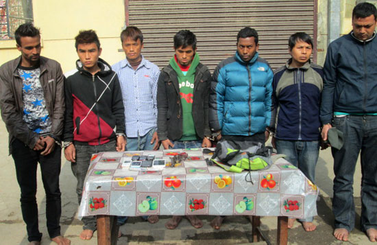 \"arrested-by-police\"पर्वतको भोकसिङ गाविस ३ वस्ने प्रेमबहादुर कर्माको छोरा वर्ष २७ को पुष्कर लोहनी, सुनसरीको धरान नगरपालिका १५ संगम चोक बस्ने भेषबहादुर तामाङको छोरा वर्ष ३० को बर्मा तामाङ, धादिङको झार्लाङ्ग गाविस २ का विरबहादुर तामाङको छोरा वर्ष २७ को स्यामोल तामाङ, नुवाकोटको बेलकोट गाविस ३ बस्ने चन्द्रबहादुर दर्जीको छोरा वर्ष २५ को रामशरण नेपाली, सोही स्थानका श्यामबहादुर परियारको छोरा वर्ष २७ को रोशन परियार, काभ्रेपलाञ्चोक धुलिखेल नगरपालिका. १ वस्ने वर्ष २७ को रुषी भन्ने प्रेम तामाङ र धादिङको तिपलिङ गाविस ८ घर भएका पेम्वा घलेको छोरा वर्ष २७ को वेशिल घलेलाई महानगरीय प्रहरी परिसर काठमाडौंको टोलीले पक्रेको हो ।