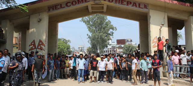\"balhiya-naka\"नेपालगञ्ज । विगत दश दीन देखि विना अवरोध सञ्चालित नेपालगञ्जको रुपैडिया नाका आज विहान बाट अबरुद्ध भएको छ । मधेसी मोर्चाका कार्यकर्ताहरु आज विहान देखि नाकामा धर्ना बसेर नाका अवरुद्ध गरेपछि भारतबाट नेपाल प्रवेश गनर्् कुनै पनि मालबहाक सवारी साधनहरु नेपाल भित्रिन सकेका छैनन् । विहानै देखि नाकामा अवरुद्ध गर्न खोजेपछि प्रहरीले राजकुमार दिक्षित सहित मधेसी मोर्चाका ४ कार्यकर्तालाई पक्राउ गरेको छ । अहिले पनि मोर्चाका कार्यकर्ता हरु नेपालगञ्जको दशगजा क्षेत्रमा जम्मा भएर प्रर्दशन गरिरहेका छन् ।