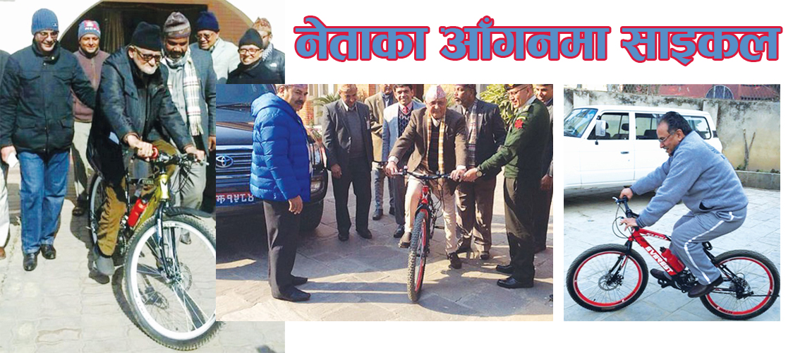 \"neta_saikal\"काठमाडौं । जनसंख्या तथा वातावरणमन्त्री विश्वेन्द्र पासवानले मन्त्रालयबाट साइकल किन्न लगाई तीन दलका शीर्ष नेताहरुलाई मंगलबार साइकल उपहार दिए  । नाकाबन्दी लागे साइकल चढ्ने सम्मको उद्घोष गरेका नेताहरुले आफ्ना बंगालाका आँगनमा एकैछिन साइकल चलाएपनि ।   नाकाबन्दीका कारण जनताको चुलो नबलिरहेको र कम्बल नपाएर भूकम्पपिडित चिसोका कारण दैनिक मरिरहेका बेलामा शिर्ष नेताहरुले देखाएको यो ठट्टा उनिहरुका लागी कतै महंगो पर्ने त होइन ? बाँकी कुरा पाठक र ती नेताहरुले सोचून् जसले आँगनमा साइकल चलाएर दुनियाँ हसाए ।   यी तस्विर अहिले सामाजिक संजालमा भाईरल भईरहेका छन् र नेताहरुलाई संजाल प्रयोगकर्ताले उडाईरहेका छन् । यस्ता अप्रासांगिक काम गर्नुहुँदैन भनेर नेताहरुको बुद्धी कहिले आउँछ खै !