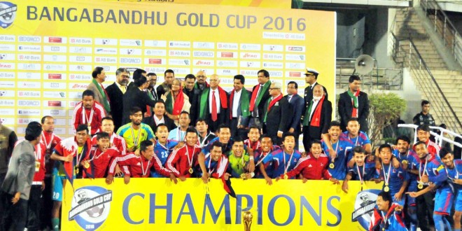 \"nepal-5-660x330\"काठमाडौं । २३ वर्षपछि ठूलो उपाधि जित्ने क्रममा बहराइनलाई हराएर बंंगबन्धु गोल्डकप जितेको नेपाली फुटबल टोली स्वदेश फर्कंदा विशेष स्वागत गर्ने तयारी भएको छ । बहराइनलाई ३–० गोल अन्तरले पाखा लगाउँदै उपाधि जितेको नेपाल साढे १ बजे काठमाडौं आएपछि विशेष स्वागत गर्ने एन्फाले तयारी गरेको छ । नेपाली टोली विमानस्थल आएलगत्तै नगर परिक्रमा गर्ने र दशरथ रंगशालामा विशेष स्वगत गर्ने तयारी एन्फाले गरेको छ । १९९३ मा ढाकामै भएको सागमा नेपालले बंगलादेशको यही बंगबन्धु स्टेडियममा भारतलाई टाइब्रकेरमा पराजित गर्दै फुटबलतर्फ उपाधि जितेको थियो । त्यसयता काठमाडौंमा भएको १९९९ को साफ च्याम्पियन्सीपमा फाइनलमा नेपाल बंगलादेशसँगै पराजित हुन पुगेको थियो । लामो समयपछि उपाधिको खडेरी मेटाएको नेपाली टिमले उपाधिसँगै ५४ लाख नगद पनि हात पारेको छ । उपाधि जिताएको टिमका प्रत्येक सदस्यले ७÷७ लाख रुपैयाँ नगद पनि पाउने भएका छन् । एन्फाले जनही पाँच लाख र राखेपले जनही दुई दुई लाख नगद दिने घोषणा गरिसकेका छन् । नेपाली टिम विजयी भएसँगै प्रधानमन्त्री केपी शर्मा ओलीसहितका पार्टीका शीर्ष नेताले बधाई दिएका छन् ।