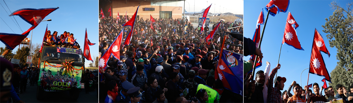 बुधबार साँझ काठमाडौं आइपुगेको खेलाडी टोलीलाई नगर परिक्रमासहित स्वागत गरिएको हो ।टोलीको स्वागतमा त्रिभुवन अन्तराष्ट्रिय विमानस्थल पुगेको युवा तथा समर्थकहरुको समुहले फूलामाला र अविरजात्रा गरी उनीहरुको स्वागत गरेका थिए ।