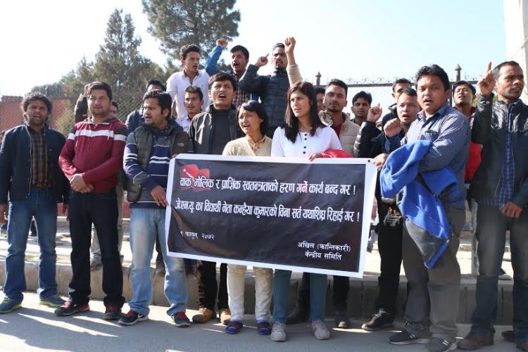 \"krantikari-biplab\" काठमाडौं । भारतको जवाहरलाल नेहरु विश्वविद्यालय विद्यार्थी युनियनका अध्यक्ष कन्हैयाकुमारलाई रिहा गर्न माग गर्दै विप्लव माओवादीका विद्यार्थी संगठन अखिल क्रान्तिकारी भारतीय दूतावास पुगेको छ । संगठनका अध्यक्ष पूर्ण सिंहको नेतृत्वमा गएको विद्यार्थीहरुको समूहले दूताबास घेराउ गर्दै कन्हैया कुमारको रिहाइको माग गरे । कन्हैयाकुमारले दिएको अभिब्यक्तिको विषयलाई राजद्रोहमा अभियोगमा पक्राउ गरिएको छ । \"JNU-President-Kanhaiya-Kumar\"वाक स्वतन्त्रतासम्बन्धी विषयलाई बढवा दिने अभिप्रायले गरिएको भाषणलाई लिएर कन्हैयालाई भारतीय सुरक्षाकर्मीले पक्राउ गरी राजद्रोहको अभियोग लगाएको छ । उनलाई राजद्रोहको अभियोग लगाई पक्राउ गरिएको तथा विद्यार्थीहरु विश्वविद्यालयबाट निश्कासन गरिएको तथा प्राध्यापकहरुलाई आतंकित पार्ने काम गरेको भन्दै नेपालका विभिन्न विद्यार्थी सगठन तथा बुद्धिजीवीहरुले विरोध जनाउँदै आएका छन् । दिल्लीस्थित प्रसिद्ध विश्वविद्यालय जेएनयुमा सन् २०१३ मा फासी दिइएका कश्मिरी युवा अफजल गुरुको विषयमा राखिएको कार्यक्रममा भारतीय सत्ताधारी दल विजेपीको विद्यार्थी संगठनले हमला गरे पछि तथा सो कार्यक्रममा पाकिस्तान समर्थित नारा लागाएको र त्यसको संयोजन विद्यार्थी नेता कन्हैयाले गरेको भन्दै उनीमाथि भारत सरकारले गत साता मात्रै राजद्रोहको मुद्धा लगाएको थियो । तर विद्यार्थी समर्थित जेएनयुका प्रोफेसर तथा विभिन्न विद्यार्थी संगठनहरुले वाक स्वतन्त्रता कुण्ठीत गर्दै कन्हैयामाथि लगईएको राजद्रोहको मुद्धा भने सरकारको फासीवादी कदमको उदाहरण भएको बताउँदै त्यसको विरोध गर्दै आई रहेका छन् । कार्यक्रममा सहभागि कवि निभा शाहले भारतमा लोकतन्त्र खुम्चिदै गएकाले यसको लोकतन्त्रको आवाज सिमाविहिन हुने भन्दै आफू प्रर्दशनमा सहभागि हुन आई पुगेको बताइन । गत शुक्रबार मात्र भारतका सबै बामपन्थी दलहरुले भारत सरकारको सो निर्णयको विरोध गर्दै राजधानी दिल्लीमा आजसम्मकै ठुलो प्रर्दशन गरेका थिए । यसअघि एमाओवादीका विद्यार्थी संगठन अखिल क्रान्तिकारीले पनि विज्ञप्ति जारी गरी कन्हैयालाई तत्काल रिहा गर्न माग गरेको थियो ।