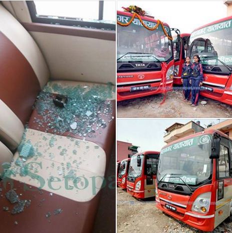 सञ्चालनको दोस्रो दिनमै मेट्रो बसमा ढुङ्गा प्रहार