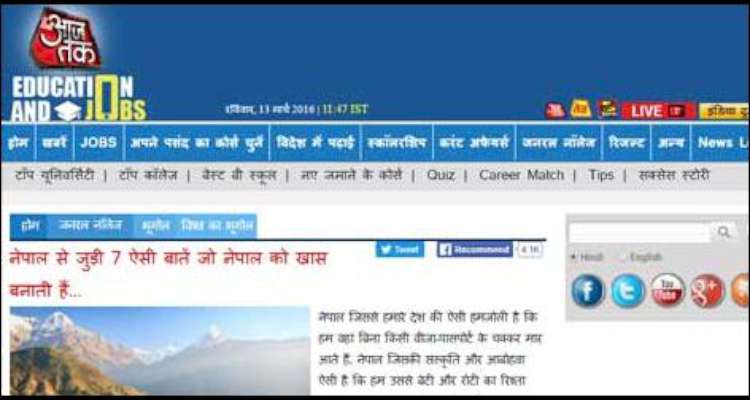 \"aajtak-750\"एजेन्सी । पृथ्वीनारायण शाहले नेपाललाई दुई ढुङ्गाबिचको तरुल नै भनिदिए । त्यस यता नेपाल सधंै कुनै न कुनै ढंगले भारतको बलमिच्याँइबाट अछुतो रहन सको । भर्खरै लगाएको नाकाबन्दीले झनै भारतलाई हेर्ने नेपालीहरुको दृष्टिकोणमा ठूलो दरार पैदा ग¥यो । तर भारतीय संञ्चार माध्यम आजतकले भने नेपालको गौरवगान गाएर एउटा समाचार लेखेको छ । उक्त समाचारमा आजतकले नेपाल एक रमणीय देश भएको र त्यहाँ घुम्न जान पासपोर्ट नलाग्नेदेखि लिएर बेटी र रोटीको सम्बन्ध भएकोसमेत उल्लेख गरेका छन् । आजतकले पर्यटकिय दृष्टिबाट नेपालको विषेशताहरु निम्मानुसार रहेको उल्लेख गरेका छन् ः १. नेपाल कहिले अरुको गुलामी भएन : २सय वर्ष बेलायतले शासन गरेको देश हो भारत । तर नेपाल भने स्वतन्त्र रहेको आजतकले उल्लेख गरेको छ। २. हिमालयको देशः नेपाललाई आजतकले हिमालयको देश भनेको छ । उसले विश्वको सबैभन्दा अग्लो सगरमाथा नेपालमै पर्ने उल्लेख गरेको छ । ३. गौतम बुद्धको देश : कतिपय भारतीय मिडियाहरुले गौतमबुद्ध भारतमा जन्मेको भनीरहेपछि आजतकले भने बुद्ध नेपालको लुम्बिनी अञ्चलको कपिलबस्तुमा जन्मिएको बताएको छ । ४. आन्तरिक द्धन्दमुक्त देश : बहु जाति भाषा र सम्प्रदायको संगम थलोको रुपमा रहेको नेपाल धेरै भाषा र जाति भएपनि आन्तरिक द्धन्दमा आजसम्म कहिल्यै नपरेको देश भनि आजतकले लेखेको छ । ५. गोर्खालीहरुको देश : आजतकले गोर्खाली सेनाको सम्मान गर्दै बहादुर सेना भएको देश भनेको छ । उसले भारतसँगपनि गोर्खा रेजिमेन्ट भएको बताएको छ । ६.विभिन्न जात र १२३ भाषा भएको देश : आजतकले यति सानो मुलुकमा यति धेरै विविधता रहेको देश भनेर प्रसंसा गरेको छ ।