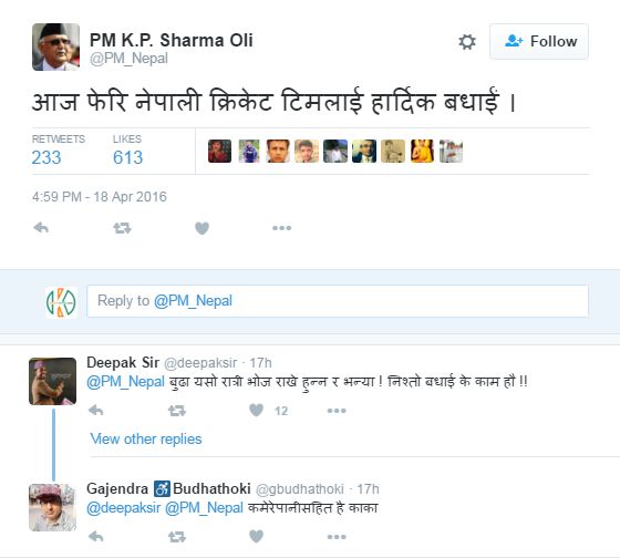 \"oli\"\"deuba\"\"baburam\" \"gagan \"Prachanda\"काठमाडौं । नेपालले लगातार नामिबियालाई जितेपछि सम्पूर्ण खेलप्रेमीमात्र होइन । प्रधानमन्त्रीदेखि राजनीतिक दलका नेताहरुसमेत खुशी छन् । नेपालले सोमबार नामिबियालाई तीन विकेटले हराएपछि सामाजिक संजाल फेसबुक र ट्वीटरमार्फत प्रधानमन्त्री केपी ओलीदेखि, एमाओवादी अध्यक्ष प्रचण्ड, कांग्रेस सभापति शेरबहादुर देउवा,  नयाँ शक्तिका संयोजक बाबुराम भट्टराई, युवा नेता गगन थापासम्मले नेपाली टिमको जितप्रति बधाई दिंदै सम्मान व्यक्त गरेका छन् । उपराष्ट्रपति नन्दबहादुर पुन त शनिबारको खेलमा नेपाली टिमलाई हौस्याउन त्रिभुवन विश्वविद्यालय क्रिकेट मैदान कीर्तिपुरमा पुगेका थिए । प्रधानमन्त्री केपी ओली पनि सोमबार खेल सुरु हुनु अघि नै कीर्तिपुर पुर झण्डै एक घण्टा नेपालको खेल हेरेर फर्किएका थिए । गृहमन्त्री शक्तिबहादुर बस्नेत शनिबार र सोमबार र दुवै दिन क्रिकेट हेर्न पुगे । उनीहरुले सामाजिक संजालमा व्यक्त गरेका खुशी, बधाई र सम्मान यस्ता छन् :