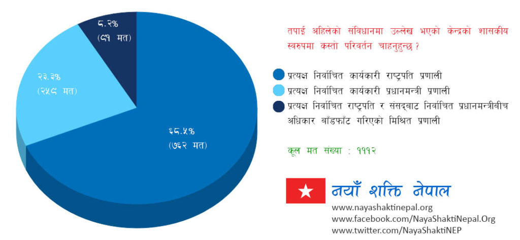 \"Poll\"काठमाडौं । नयाँ शक्ति नेपालले लिएको जनमत सर्वेक्षणमा प्रत्यक्ष निर्वाचित कार्यकारी राष्ट्रपति प्रणालीको पक्षमा सबैभन्दा धेरै मत प्राप्त भएको छ । इन्टरनेटमार्फत गरिएको सर्वेक्षणमा कूल १११२ मत प्राप्त भएकोमा सबैभन्दा धेरै ७६२ मत (६८.५ प्रतिशत) प्रत्यक्ष निर्वाचित कार्यकारी राष्ट्रपति प्रणालीमा देखिएको छ । प्रत्यक्ष निर्वाचित कार्यकारी प्रधानमन्त्री प्रणालीको पक्षमा २५९ मत (२३.३ प्रतिशत) मत प्राप्त भएको छ भने प्रत्यक्ष निर्वाचित राष्ट्रपति र संसद्बाट निर्वाचित प्रधानमन्त्रीबीच अधिकार बा“डफा“ट गरिएको मिश्रित प्रणालीको पक्षमा जम्मा ९१ मत (८.२ प्रतिशत) मत जाहेर भएको छ । दुई तिहाई मत प्रत्यक्ष निर्वाचित कार्यकारी राष्ट्रपतिको पक्षमा आएको छ भने प्रत्यक्ष निर्वाचित कार्यकारी प्रधानमन्त्रीको समेत जोड्दा प्रत्यक्ष निर्वाचित कार्यकारीको पक्षमा ९० प्रतिशत भन्दा धेरै मत देखिन्छ । संविधानको मस्यौदामाथि जनमत संकलनका क्रममा समेत अधिकांश जनताको मत प्रत्यक्ष निर्वाचित कार्यकारीकै पक्षमा थियो । नया“ शक्ति नेपालले आजदेखि बैशाख १२ को भूकम्प र पुनःनिर्माणको सन्दर्भमा अर्को जनमत सर्वेक्षण सुरु गरेको छ । नयाँ शक्ति नेपालको वेवसाइटमा गई मत दिन सकिनेछ । जनमतको प्रश्न र विकल्पहरु भूकम्प गएको एक वर्ष बितिसक्दा पनि द्रूत गतिमा अघि बढ्नुपर्ने पुनःनिर्माण÷नवनिर्माणको काम अघि बढ्न सकिरहेको छैन । अब के गर्नुपर्ला ? – काम अघि बढाउन दवाव दिनुपर्छ – ऐन नै संशोधन गरी अधिकारसम्पन्न शक्तिशाली प्राधिकरण बनाउनुपर्छ – सरकारले नै केही गर्ला कि त ?