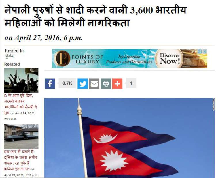 \"Capture-750\"काठमाडौं । नेपालले तीन भारतीय नागरिकको नागरिकता खारेज गरे लगत्तै भारतीय मिडियाले ३,६७२ जना भारतीय महिलाले नेपाली नागरिकता पाउने बताएको छ । एक भारतीय समाचार संस्थाले नेपालमा बनेको नयाँ संविधानमा अंगीकृत नागरिकता सम्बन्धि भएको व्यवस्था अनुसार भारतीय महिलाहरुले नागरिकता पाउने बताएको छ । मधेसमा रहेका नेपाली नागरिकसँग विवाह गरेका ती महिलाहरुले नागरिकता पाउने भएका हुन् । तराई–मधेसमा भएको आन्दोलनका क्रममा उक्त मुद्धा निकै जोडतोडका साथ उठेको थियो । यो विषयमा भारतीय विदेशमन्त्री सुस्मा स्वराजले समेत भारतीय संसदमा बोल्दै नेपाली पुरुषसँग विवाह गरेका भारतीय महिलाहरुले नेपाली नागरिकता पाउनु पर्ने बताएकी थिइन् । नेपालको नयाँ संविधानको अनुच्छेद ११(६)मा नेपाली व्यक्तिसँग विवाह गरेकी विदेशी महिलाहरुले संघीय कानून अनुसार नागरिकता पाउने व्यवस्था गरेपछि उनीहरुलाई नागरिकता दिने भएको हो । संविधानमा व्यवस्था भए अनुसार भारतीय महिलाले नेपाली नागरिकता पाउँने भएपछि विभिन्न भारतीय समाचार संस्थाहरुले त्यसलाई समाचारका सामग्रीका रुपमा निकै महत्व दिएर प्रकाशित गरेका छन् ।