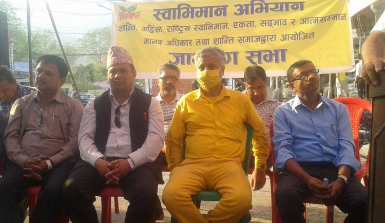 \"humen कपिलवस्तु । मानव अधिकार तथा शान्ति समाजले देशब्यापी रुपमा जागरण सभा थालेको छ । जागरण सभाका क्रममा टोली कपिलवस्तु र प्युठानमा सभा सम्पन्न गरेको छ । शुक्रबार कपिलबस्तुको तौलेश्वर महादेब मन्दिर चोकमा भएको सभामा प्रमुख बक्ताको रुपमा आफ्नो धारणा राख्दै मानव अधिकार तथा शान्ति समाजका संस्थापक सभापति कृष्ण पहाडीले नाकाबन्दी मानवता बिरुद्धको अपराध भएको कारण कुनै पनि प्रकारको नाकाबन्दीका बिरुद्धमा आफू सडकमा उत्रने बताए । पहाडीले सबैका लागि राष्ट्र र राष्ट्रियता सबैभन्दा माथी हुने चर्चा गर्दै राष्ट्रिय स्वाभिमान बिरुद्ध कहिं कतै सम्झौता हुनु नहुने बताए । कार्यक्रममा संघीय समाजबादी फोरमका दिपक पाण्डे, नेपाल सद्भावना पार्टीका केन्द्रिय सदस्य रबिन्द्रनाथ मिश्र, तराई मधेश लोकतान्त्रिक पार्टीका धरमबहादुर लाल श्रीवास्तव, नेपाल परिवार दलका जिल्ला अध्यक्ष राघवेन्द्र श्रीवास्तव तथा अधिकार कर्मिहरु मधेश मानव अधिकार गृहका अध्यक्ष रबि ठाकुर, रामदयाल ठाकुर, साहित्यकार तथा समाजसेवीहरु पशुपतीमणी त्रिपाठी, जीवनाथ स्वामी लगायतले अभियानको सफलताको कामना गरे । कार्यक्रममा समाजका महासचिव उत्तम पुडासैनीले अभियानको औचित्यमाथी प्रकाश पारे भने कोषाध्यक्ष रेणुका पौडेलले संस्थाका गतिबिधिकाबारेमा चर्चा गरेका थिए । बिभागीय संयोजक रमेश सिंखडाले स्वाभिमान अभियान सम्बन्धमा संस्थाले तयार पारेको अवधारणा पत्र प्रस्तुत गरे । यस्तै शुुुुक्रबार अपरान्ह प्युठान जिल्लाको खलंगा स्थित पाटीचोकमा जगरण सभा सम्पन्न भएको थियो । मानव अधिकार तथा शान्ति समाजका सचिव गोबिन्द खनालको सभापतित्वमा सम्पन्न उक्त सभामा प्रमुख बक्ता कृष्ण पहाडी, नेपाली काँग्रेसका जिल्ला सभापति अमर भण्डारी, राष्ट्रिय प्रजातन्त्र पार्टीका जिल्ला उपाध्यक्ष बुद्धबहादुर जिसी, गैरसरकारी संस्था महासंघ प्युठानका अध्यक्ष रमेशकुमार श्रेष्ठ, नेपाल पत्रकार महासंघका जिल्ला अध्यक्ष गुरुप्रसाद भण्डारीले अभियानको सफलताको कामना गर्दै आ आफ्नो धारणा ब्यक्त गरे । युवा कबि सुदेश सत्यालले कबिता वाचन गरे भने शान्ति समाजका सदस्य अर्जुन अधिकारीले अवधारणा पत्र प्रस्तुत गरेका थिए ।