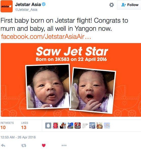 \"image\"काठमाडौं । सिंगापुर–भर्खर जन्मिएका सअ जेट स्टारलाई भविष्यमा आफ्नो अनौठो नाउँबारे सुनाउने एउटा कथा छ । आजको नागरिक दैनिकमा खबर छ–गएको साता उनकी आमा जेटस्टारको विमानमा सिंगापुरबाट म्यानमार जाँदै थिइन् । जाँदाजाँदै तीन घन्टे यात्राका दौरानमा विमानकी यात्रु उनलाई पीडा सुरु भयो । तत्काल विमानमा रहेका चिकित्सकले उनलाई प्रसुति गराए । घटना गउको २२ अप्रिलमा भएको द स्ट्रेट टाइम्स पत्रिकाले शनिबार जनाएको छ  । विमान बालकको तौल ६ पाउन्ड ७ औंस रहेको र यांगुन विमानस्थलमा पुग्नेबित्तिकै आमा र नवजात शिशुलाई अस्पताल पुर्याइएको बताइएको छ । अस्पतालले दुवैको स्वास्थ्य राम्रो रहेको भन्दै घर पठाइदिएको छ । विमानभित्रै बच्चा जन्मिएपछि यात्रुले तालीले स्वागत गरेका थिए । उडानकै क्रममा जन्मिएको बच्चालाई जेटस्टार विमानले एक हजार सिंगापुरे  डलर बराबरको पुरस्कार दिएको छ । जेटस्टार कम दाममा विमान उडाउने कम्पनीका रुपमा चिनिन्छ ।
