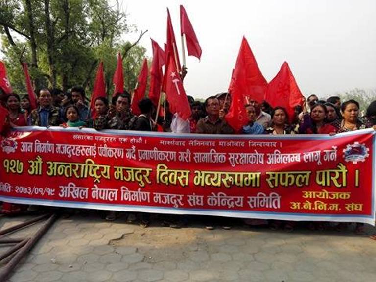 \"Intl-Labour-Day\"काठमाडौं । आज मे दिवश १२७ औं अन्तराष्ट्रिय मजदुर दिवस नेपालमा पनि विभिन्न कार्यक्रम गरी मनाईदै छ । विभिन्न राजनैतिक दलसँग आवद्ध मजदुर संगठनहरुले विभिन्न कार्यक्रमहरु गरी मे दिवश मनाउन लागेका हुन । एनेकपा (माओवादी ) संवद्ध अखिल नेपाल ट्रेड युनियन महाँसंघले मजदुर दिवशकाे अवशरमा काठमाडौंक भृकुटीमण्डपबाट र्याली शुरु गरेर शान्तिबाटिकामा सभा गरेको छ भने , वैद्य माओवादी संवद्ध टेड युनियन महासंघले ११ वजे देखि ललितपुरको पुल्चोक र सुुन्धारा बाट रयलली शुरु गरेर कुपन्डोलमा सभा गर्ने भएको छ । त्यसै गरि विभिन्न राजनैतिक दलसँग आवद्ध विभिन्न मजदुर संगठनहरुले विभिन्न कार्यक्रम आयोजना गरि मजदुर दिवश मनाउन लागेका छन् । ८ घण्टा काम , ८ घण्टा आराम र ८ घण्टा मनोरञ्जनको समयको माग गर्दै अमेरिकाको सिकागो शहर र युरोपका मजदुरहरुले गरेको संघर्षको स्मरण गर्दै आज मे १ तरिखका दिन विश्वभर अन्तराष्ट्रिय मजदुर दिवश मनाउने गरिन्छ । मजदुरहरुले निकै ठुलो संघर्ष गरेर अधिकार प्राप्त गरेको दिनको स्मरण स्वरुप अन्तराष्ट्रिय मजदुर दिवश हरेक साल मनाउने गरिन्छ । सन् १८९० देखि यो दिवश विश्वभर मनाउन थालिएको हो । नेपालमा १९६३ देखि मजदुर दिवश मनाउन थालिएको हो भने वि सं २०६४ सालबाट मात्र अधिकारीक रुपमा मजदुर दिवशको दिन विदा दिन शुरु गरिएको हो ।