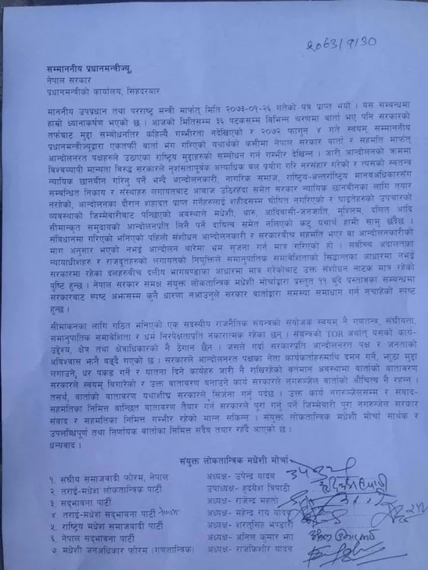 आन्दोलनरत मोर्चाले सरकारलाई लेख्यो यस्तो पत्र