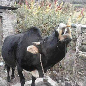 \"tirkha1\"पाल्पाको पोखराथोकमा तिर्खा लागेपछि खानेपानीकाे धारामै मुख थापेर पानी खाँदै एक चौपाया ।