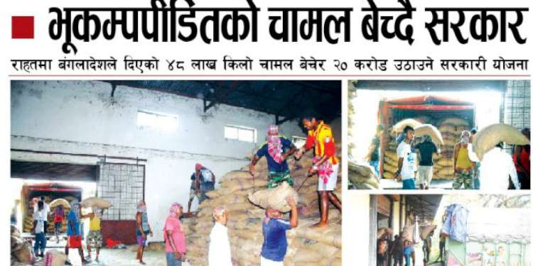 \"chamal-660x330-750\" काठमाडौं । सरकारले भूकम्पपीडितका लागि देश–विदेशबाट लाखौा किलो चामल संकलन गर्‍यो । जसमध्ये बंगलादेशले मात्रै ७८ लाख २९५ किलो चामल पीडितका लागि नेपाल पठायो । पीडितहरू चामल पाउने आशामा सरकारको बाटो हेरेर बसे । तर, सरकारले भोकभोकै बसेका पीडितलाई चामल बााडेन, बरु झापास्थित नेपाल खाद्य संस्थानको डिपोमा थन्क्याएर राख्यो । आजको नयाँ पत्रिका दैनिकमा सविन मिश्र, काठमाडौं र सुव्रत न्यौपानेले झापाबाट समाचार लेखेका छन् । एक वर्षपछि जब कुहिन थाल्यो तब सरकारले गोदाममा थन्क्याएको चामल बाहिर त निकालेको छ । तर, भूकम्पपीडितलाई वितरण गर्न होइन, काठमाडौंमा प्रतिकेजी ४१ रुपैयाामा बेचेर रकम उठाउन । १०७ बोरा चामल त गोदाममै कुहियो । बंगलादेशले पठाएको चामलमध्ये ४८ लाख २९५ किलो चामल बिक्री गरेर झन्डै २० करोड रकम उठाउने सरकारको लक्ष्य छ । काठमाडौंका अतिरिक्त गोरखा, मध्य र सुदूरपश्चिमका पहाडी जिल्लामा पनि चामल बिक्री गर्ने सरकारी योजना छ । भूकम्पपीडितका लागि चीन सरकारले अनुदानमा दिएको एक लाख किलो चामल पनि ४० रुपैयाा प्रतिकेजीका दरले बजारमा बिक्री गर्ने सरकारको तयारी छ । भूकम्पपीडितका लागि बंगलादेश र चीनले सहयोगस्वरूप दिएको चामल सरकारले बेच्न थालेको छ । भूकम्पपछि राहतका लागि आएको चामल एक वर्ष गोदाममा थन्क्याएर बेच्न लागेको हो । बंगलादेशबाट सहयोगस्वरूप गत वर्ष प्राप्त ७८ लाख दुई सय ९५ किलो चामल झापाको काँकडभिट्टास्थित नेपाल खाद्य संस्थानको डिपोमा एक वर्ष थन्किएको थियो । खाद्य संस्थानलाई चैतको अन्तिम साता वाणिज्य मन्त्रालयले चामल बेच्न स्वीकृति दिएको थियो । त्यसैअनुसार संस्थानले चामल काठमाडौं ल्याएर बेच्न थालेको हो । त्यो चामल संस्थानले काठमाडौंमा प्रतिकेजी ४१ रुपैयाँमा बेच्न थालेको छ । बंगलादेशबाट सहयोगमा प्राप्त चामलमध्ये ४८ लाख दुई सय ९५ किलो चामल बेचिँदै छ । बिक्रीबाट सरकारले करिब १९ करोड ८० लाख रुपैयाँ प्राप्त गर्ने अनुमान छ । ‘यो पैसा संस्थानले खर्च गर्ने होइन,’ संस्थानका प्रवक्ता पवन कार्कीले भने, ‘सरकारको आपत्विपत् कोषमा हामीले त्यो पैसा बुझाउनुपर्छ ।’ गोरखा, नेपालगन्ज, धनगढी र सुर्खेतमा पनि बेचिँदै संस्थानले झापा गोदामको चामल गोरखा, नेपालगन्ज, धनगढी र सुर्खेत पुर्‍याएर आसपासका पहाडी जिल्लामा बिक्री गर्ने तयारीसमेत गरेको छ । ती ठाउँमा बेचिने चामलको मूल्य भने तोकिएको छैन । ‘ढुवानी भाडा हिसाब गरेपछि मात्रै ती ठाउँमा बेचिने चामलको मूल्य तोकिनेछ,’ संस्थानका प्रवक्ता पवन कार्कीले भने ।