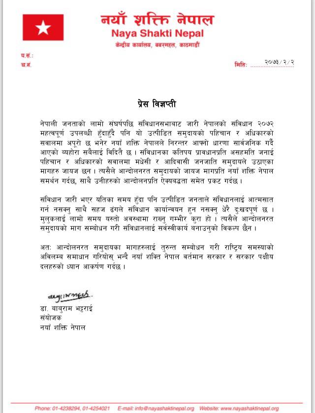 काठमाडौं । मधेसवादी तथा जनजाति सहितको २७ दलिय संघीय गठबन्धले शुरु गरेको सिंह दरबार घेराउको आन्दोलनप्रति नयाँ शक्ति नेपालले एक्यवद्धता जनाएको छ । आइतबार एक विज्ञप्ति जारी गर्दै नयाँ शक्ति नेपालका संयोजक डा. बाबुराम भट्राईले नयाँ शक्तिले शुरु देखि नै उत्पिडित समुदायको पहिचान र अधिकारको सवालमा संविधान अपुरो रहेको भन्दै आफ्नो धारणा सार्वजानिक आएको भन्दै मधेसी र जनजातिको मागमा एक्यबद्धता रहेको जनाएका छन् । नयाँ शक्तिले आन्दोलनरत समुदायको माग तत्काल सम्बोधन गरि राष्ट्रिय समस्याको अविलम्व समाधान गर्न माग गरेको छ । \"Nayashakti-bigyapti-on-2-Jeth\"