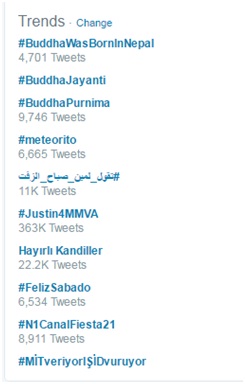 \"BuddhaWasBornInNepal\"काठमाडौं । नेपालमा बुद्ध पूर्णिमाको अवसरमा विभिन्न कार्यक्रमहरु भइरहँदा ट्वीटरको ट्रेन्डिङ पनि बुद्धकै देखिएको छ । #BuddhaWasBornInNepal शनिवार ट्वीटरको टप टे«न्डिङ बन्न पुगेको छ । समाजिक सञ्जालहरुमा बुद्ध नेपालमा जन्मिएको भन्ने सन्देश विश्वभर फैलाएपछि यसको ट्रेन्डिङ पनि टप हुन पुगको हो । यो ट्रेन्डिङ मात्र नभइ बुद्ध जयन्ती र बुद्ध पूर्णिमा ट्रेन्डिङ पनि ट्वीटरमा चर्चित बनेको छ । सामाजिक सञ्जाल प्रयोगकर्ताहरुले ट्वीटरमा बुद्ध नेपालमा जन्मिएको सन्देश विश्वभर फैलाउन भन्दै यो ट्रेन्डिङ प्रयोग गरेका छन् । यसअघि गत वर्ष नेपालमा शक्तिशाली भूकम्पको बेला भारतीय मिडियाहरु नेपाल आएर गलत प्रचार गरेको भन्दै सामाजिक सञ्जाल प्रयोगकर्ताहरुले गोहोमइन्डियनमिडिया ट्रेन्डिङ बनाएका थिए । जसले विश्वभरी नै तरंग मच्चाएको थियो ।