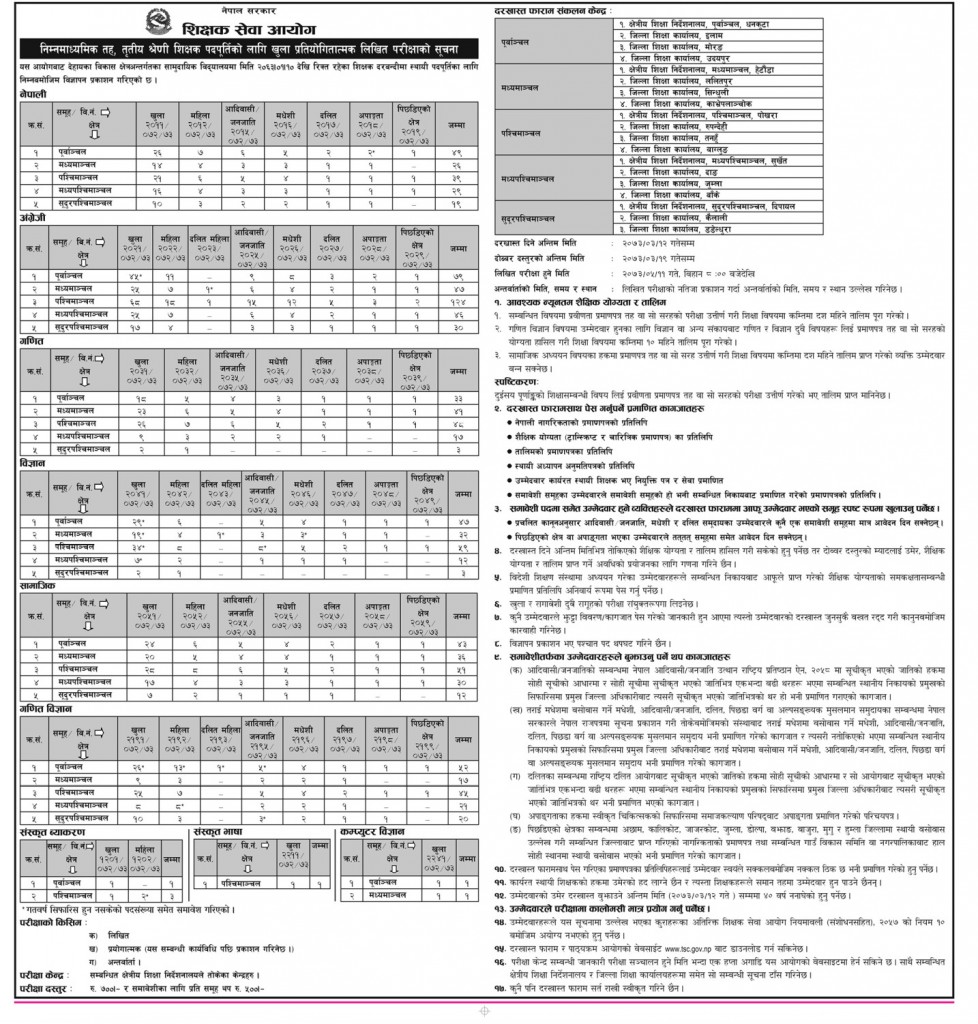 काठमाडौं । शिक्षक सेवा आयोगले निम्न माध्यमिक तह तृतीय श्रेणीको शिक्षकमा १११७ जना लागि विज्ञापन आह्वान गरेको छ । आयोगले सोमबार सार्वजनिक गरेको विज्ञापनमा नेपाली, अंग्रेजी, गणित, विज्ञान, सामाजिक, गणित विज्ञान, संस्कृतलगायतका विषयगत शिक्षक माग गरिएको छ । योग्य उम्मेद्वारले आउँदो असार १२ गतेसम्म दरखास्त बुझाउन सक्नेछन् दोब्बर दस्तुरमा असार १९ गतेसम्म दरखास्त दिन सकिने आयोगले जनाएको छ। आवेदन शुल्क रु ७ सय रुपैयाँ लाग्ने र प्रत्येक समावेशी समुहका लागि थप ५ सयका दरले शुल्क लाग्ने आयोगले जनाएको छ। उक्त विज्ञापनको लिखित परीक्षा भदौ ११ गते हुने जनाएको छ। प्रविणता प्रमाणपत्र तह उत्तीर्ण गरी अध्यापन अनुमति पत्र भएकाहरुले दरखास्त दिन सक्नेछन् । \"978x1024\"