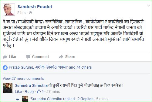 \"sandesh_poudel\"काठमाडौं । माओवादी केन्द्रका केन्द्रिय सदस्य सन्देश पौडेलले पार्टीका सम्पूर्ण जिम्मेवारीहरुबाट राजिनामा दिएको घोषणा गरेका छन् । सामाजिक संजाल फेसबुकमा बुधबार बिहान एक पोष्ट लेख्दै राजिनामा दिएको घोषणा गरेका हुन् । उनले राजिनामा दिनुको कारणबारे भनेका छन्, –‘ने.क.पा. माओवादी केन्द्र राजनितिक, सागठनिक , कार्ययोजना र कार्यशैली का हिसावले अन्तत संसदवादको वाटोमा नै अगाडि वड्यो । त्यसैले यस पार्टी मार्फद नेपाली जनता को मुक्तिको लागि थप योगदान दिने सम्भवना अन्त्य भएको महशुस गरि आजकै मितीदेखी यो पार्टी छोडेको छु ।’ चीतवन स्थायी घर भएका पौडेल एमाओवादीका पुराना केन्द्रिय सदस्य हुन् । पार्टी एकिकरण हुँदा नारायणकाजी श्र्रेष्ठसँगै एमाअाेवादी भएका पौडेल लामो समयसम्म वाइसिएल नेपालमा रहेर काम गरेका थिए ।