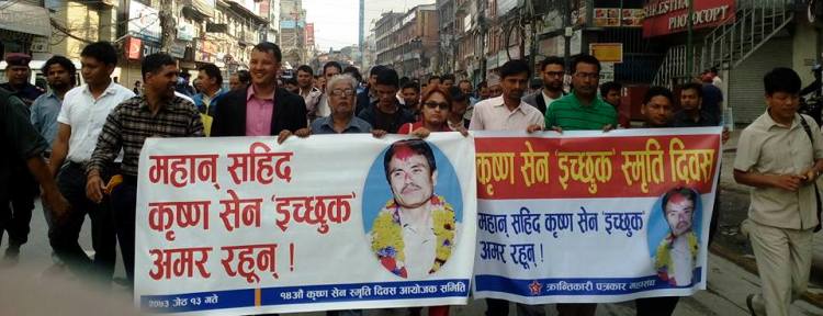 \"krishnaकाठमाडौं। चौध वर्षअघि हत्या गरिएका जनपक्षीय पत्रकार स्वर्गीय कृष्ण सेन ‘इच्छुक’को हत्यामा संलग्नलाई कारबाही गर्न माग गरिएको छ । क्रान्तिकारी पत्रकार इच्छुकको १४औँ स्मृति दिवसका अवसरमा बिहीबार बिहान आयोजित कार्यक्रममा सहभागी पत्रकारले परिवर्तनको पक्षमा उत्सर्ग गर्ने इच्छुकके हत्यामा संलग्नलाई कारबाही नभएको भन्दै दु ःख व्यक्त गरेका हुन् । स्व। इच्छुककी जीवन सङ्गीनी तक्मा केसीले सेनका हत्यारालाई कारबाही नभएको भन्दै दुःख व्यक्त गरेकी थिइन। उनले इच्छुकका आदर्शमार्फत उनका सपना पूरा गर्नुपर्नेमा जोड दिइन । नेपाल पत्रकार महासङ्घका अध्यक्ष डा महेन्द्र विष्टले स्व इच्छुक एक पक्ष वा धारको भन्दा पनि मूलप्रवाहका आदर्शका रुपमा आफूले स्मरण गरेको बताउँदै भने, “युद्धमा नभई नियन्त्रणमा लिई पत्रकार सेनको हत्या भएको थियो, उनको हत्यामा सम्लग्नलाई कारबाही नहुनु दुःखद् हो ।” क्रान्तिकारी पत्रकार सङ्घका संयोजक गोविन्द आचार्यले राज्यले कृष्ण सेनका हत्यारालाई कारबाहीको सटृा पुरस्कृत गरेको भन्दै कारबाहीको माग गरे । उनले गृहमन्त्रालयको निर्देशनमा असंवैधानिकरुपमा पत्रकारलाई धरपकड गरिएको भन्दै त्यस्ता कार्य बन्द गर्न माग गरे । क्रान्तिकारी पत्रकार महासङ्घका अध्यक्ष कुमार शाहले आलोचकलाई सफाया गर्ने राज्यको अलोकतान्त्रिक कार्यलाई बन्द नगरेसम्म स्वतन्त्रताको कुनै अनुभूति नहुने भन्दै दण्डहीनताको अन्त्यका लागि सेनको हत्यामा संलग्नको कारबाही हुनुपर्ने बताए । प्रेस चौतारी नेपालका अध्यक्ष गणेश बस्नेतले परिवर्तन र जनताका पक्षमा लेख्ने पत्रकार इच्छुक भएको स्मरण गर्दै उनको आदर्शलाई सम्मान गर्नुपर्ने बताए । क्रान्तिकारी पत्रकार सङ्गठनका अध्यक्ष प्रभात चलाउनेले पद र शक्तिलाई त्यागेर जनताका पक्षमा कलम चलाउने पत्रकार इच्छुकको स्मरण गर्दै उहाँको सपना पूरा गर्ने प्रतिबद्धता व्यक्त गरे । आदिवासी जनजाति पत्रकार सङ्घका अध्यक्ष दण्ड गुरुङ, रिपोर्टर्स क्लबका अध्यक्ष ऋषि धमला लगायतले पत्रकार इच्छुकको हत्यामा संलग्नलाई कारबाही हुनुपर्नेमा जोड दिए । कार्यक्रममा पत्रकार इच्छुककै स्मरणमा स्थापित कृष्णसेन स्मृति पुरस्कार पत्रकार नीमबहादुर बुढाथोकीलाई प्रदान गरिएको छ । रु १० हजार राशिको उक्त पुरस्कार स्व इच्छुककी जीवन सङ्गीनी तक्मा केसी र क्रान्तिकारी पत्रकार सङ्का अध्यक्ष गोविन्द अचार्यले संयुक्तरुपमा प्रदान गरे । स्व इच्छुकको स्मरणमा आज शान्तिवाटिका रत्नपार्कदेखि भृकुटीमण्डपसम्म प्रभातफेरी गरिएको थियो । विसं २०५९ जेठ १३ गते इच्छुकको हत्या भएको थियो ।
