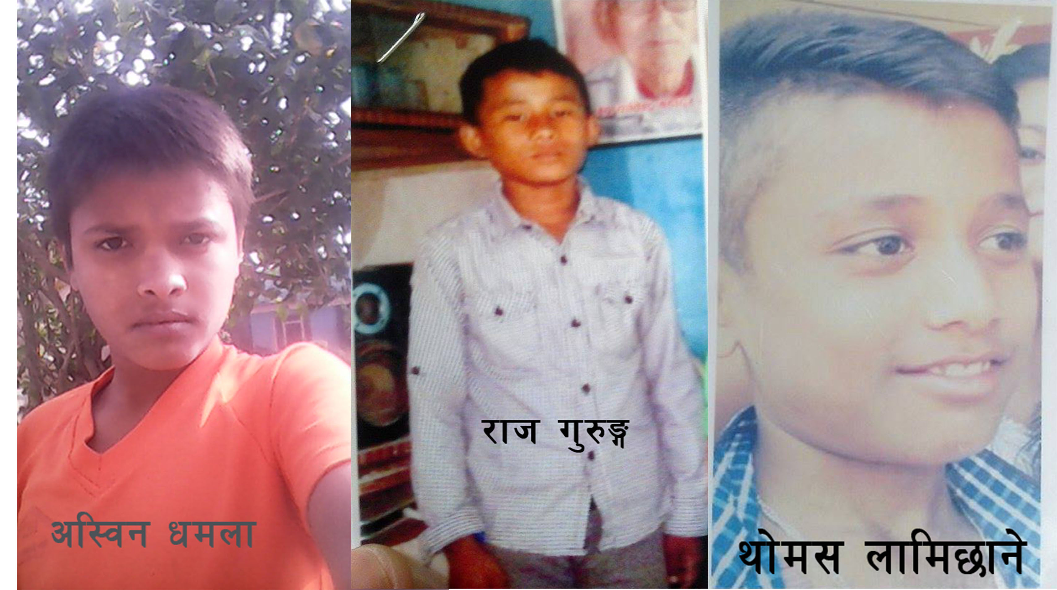 कालिका नगरपालिका – ६, खोलेसिमलका १३ वर्षीय अश्विन धमला, सोही वडा नयाँ टोलका १२ वर्षीय थोमस लामिछाने र वडा नं. ८ लंकालाईनका १४ वर्षीय राज गुरुङ्ग एकै कक्षाका दौतरी हुन् । उनीहरु सोही विद्यालयमा कक्षा ८ मा अध्ययनरत थिए । बिहान खाना खाई साईकल लिएर विद्यालय हिडेका राज गुरुङ्गको साईकल विद्यालयको गेट बाहिर छाडेको अवस्थामा पाइएको राजका बुबा लेख बहादुर गुरुङ्गले बताए ।