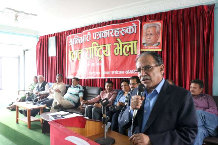 \"Revolutionary_Jounalist_Association_Unity_VELA काठमाडौं । माओवादी केन्द्रमा अध्यक्ष प्रचण्डले छिट्टै विप्लव माओवादी र नयाँ शक्तिबाट अर्को विद्रोही समूह आउने बताएका छन् । आजको नयाँ पत्रिका दैनिकमा खबर छ । अहिलेको एक हजार आयोजक समिति थपिने संकेत गर्दै उनले भने, ‘एकतामा अरू पार्टी पनि आउँदै छन्, समितिमा संख्या थपिन सक्छ । हामी अहिले १० पक्षले एकता गरे पनि अब ११–१२ पक्ष हुन लाग्दै छौं । छिटै फेरि तीन पक्ष थपिने देखेको छु ।’ उनले थपिने तीन पक्षमा विप्लवबाट अर्को विद्रोही शक्ति बनेर आउने, नयाँ शक्तिबाट आउने र नेकपा माओवादी (माक्र्सवादी) नामको पार्टी पनि आउने छलफल चलिरहेको बताए । प्रचण्डले महाधिवेशन नहुँदासम्म यो थपिँदै जाओस् भन्ने आफ्नो चाहना भएको बताए । उनले भने, ‘विचार–राजनीतिक क्लियर गरेपछि र संगठनात्मक संरचना पनि क्लियर गरिसकेपछि महाधिवेशनसम्म यो आयोजक समितिको रूपमा थपिँदै जान्छ ।’