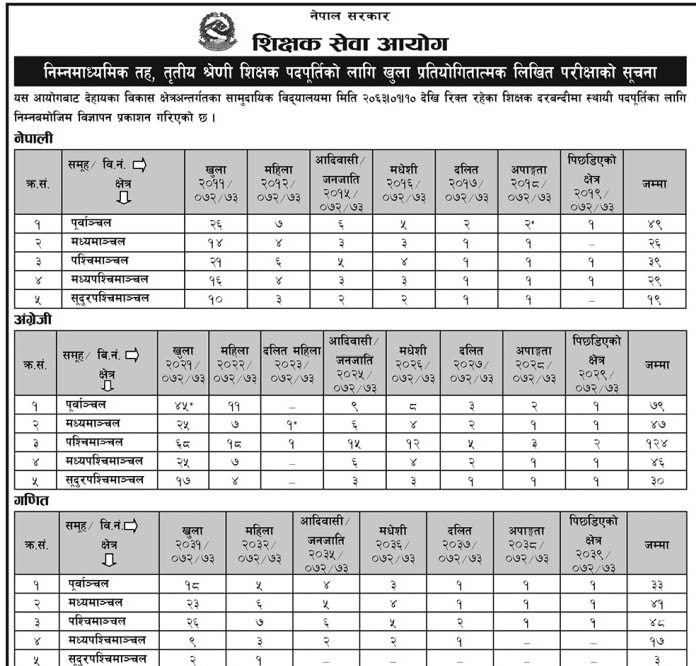 काठमाडौं । शिक्षा सेवा आयोगले स्थायी शिक्षकका लागि नयाँ दरबन्दी खुल्ला गरेको छ । देशभरका पाँचै वटा विकास क्षेत्रमा रिक्त रहेका शिक्षकको स्थायी दरबन्दीका लागि आयोगले आवेदन खुला गरेको हो । सामुदायिक विद्यालयमा २०६३ बैशाख १० देखि रिक्त रहेका शिक्षक दरबन्दीमा स्थायी पदपूर्तिका लागि दरबन्दी खुला गरिएको आयोगले जनाएको छ । पाँचै वटा विकास क्षेत्रमा १ हजार एक सय १७ शिक्षकका लागि लोकसेवा खुलाएको हो । आयोगले निकालेको विज्ञापनअनुसार नेपाली विषयका लागि १ सय ६२ जना, अंग्रेजी विषयका लागि ३ सय २६ जना, गणित विषयका लागि १४२ जना, विज्ञान विषयका लागि १५३ जना स्थायी शिक्षक पदपूर्ति गरिने भएको छ । यस्तै, सामाजिक विषयमा १७२, गणित विज्ञानमा १५५, संस्कृत ब्याकरणमा ४, संस्कृत भाषामा १ र कम्युटर विज्ञानमा २ जनाको दरबन्दीका लागि विज्ञापन प्रशासन गरिएको छ । असार १२ गतेसम्म दरखास्त दिन सकिने आयोगले जनाएको छ । दोब्बर दस्तुर तिरेर भने असार १९ गतेसम्म दरखास्त दिन सकिनेछ । लिखित परीक्षा भदौ ११ गते विहान ८ बजेदेखि शुरु हुने जनाइएको छ । \"teacher1\" \"teacher2\"
