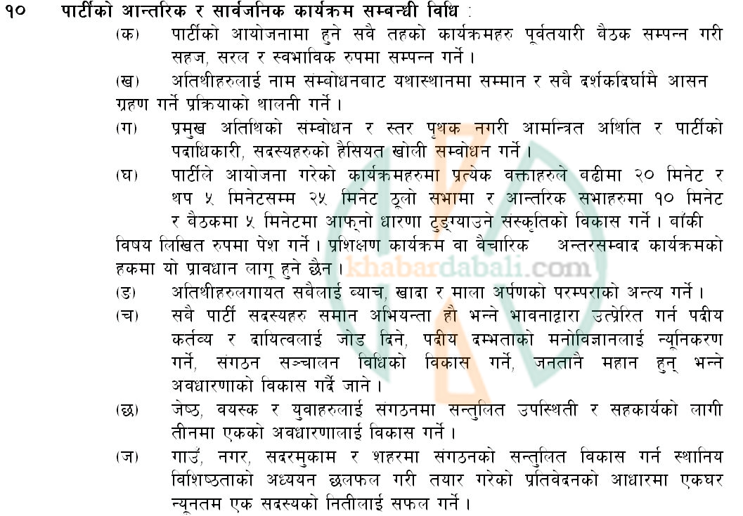 काठमाडौं । नयाँ राजनीतिक शक्तिको निर्माण प्रक्रियामा रहेको नयाँ शक्तिले आफ्नो प्रारम्भिक मस्यौदा विधानको धारा १० को घ मा ठुला सभाहरुमा प्रमुख अतिथिले २५ मिनेटभन्दा बोल्न नपाईने र ख मा अतिथिहरु पनि दर्शकदिर्घामै बस्नुपर्ने नियम प्रस्ताव गरेको छ । खबरडबलीलाई प्राप्त विधानको मस्यौदामा आन्तरिक सभाहरुमा १० मिनेट बैठकहरुमा ५ मिनेट बोल्ने समय छुट्याएको छ । साथै विधानमा प्रमुख अतिथि र अन्य अतिथिहरुलाई पृथक नगरी सम्बोधन गर्नुपर्ने समेत नियम बनाएको छ । हेर्नुहोस् अरु केके छन् प्रस्तावित नियम \"nayashakti_bidhan\"
