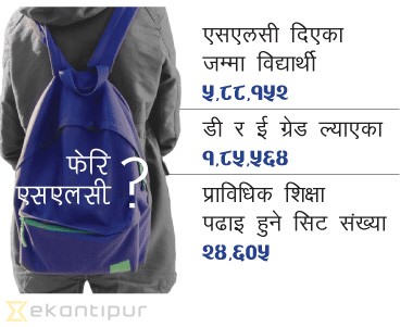 \"24062016072718page_1kpr-1000x0\" काठमाडौं, १० असार । कक्षा ११ मा विज्ञान, व्यवस्थापन, मानविकी र शिक्षाका सबैजसो विषय अध्ययन गर्न एसएलसीमा सामाजिक विषयमा डी प्लस ल्याउनै पर्ने हुन्छ । डी र ई ल्याउने विद्यार्थीले ११ मा भर्ना हुन पाउँदैनन् । आजको कान्तिपुर दैनिकमा खबर छ – नियमित र आंशिक गरी ५ लाख ८८ हजार १ सय ५२ विद्यार्थीले एसएलसी दिएकोमा १ लाख ८५ हजार ५ सय ६४ जनाले सामाजिकमा डी र ई ग्रेड मात्रै ल्याएका छन् । त्यसमा नियमिततर्फ १ लाख १२ हजार ३६ र एक्जाम्टेडतर्फ ७३ हजार ५ सय २७ छन् । उनीहरू कक्षा ११ मा विज्ञान, व्यवस्थापन, मानविकी र शिक्षामा भर्ना हुन पाउँदैनन् । यस्ता विद्यार्थीका लागि अब दुई विकल्प छन् । पहिलो, सीटीईभीटीको प्राविधिक विषय रोज्ने । दोस्रो, अर्को वर्ष फेरि १० कक्षाको परीक्षा दिने । पहिलो विकल्प रोज्नेले पनि सहजै भर्ना पाउन मुस्किल छ । किनभने प्राविधिक शिक्षा तथा व्यावसायिक तालिम परिषद् (सीटीईभीटी) सित यस्ता २४ हजार विद्यार्थीलाई मात्रै पढाउने क्षमता छ । परिषद्का सदस्यसचिव रामहरि लामिछाने भन्छन्, ‘क्षमता बढाउन मन्त्रालयसँग छलफल भइरहेको छ ।’ सीटीईभीटीले बुधबार टीएसएलसीको प्रवेश परीक्षाको फाराम वितरणको विज्ञापन गरिसकेको छ । सीटीईभीटीले कम जीपीए र विषयगत ग्रेड ल्याउने विद्यार्थीलाई १८ महिने टीएसएलसी कोर्समा अध्ययन गराउने घोषणा गरेको छ । यसअघि सीटीईभीटीले एसएलसी पास हुने विद्यार्थीलाई पढाउने १५ र फेल हुनेलाई पढाउने २९ महिने कोर्सलाई समायोजन गरेर १८ महिने बनाउने निर्णय गरेको छ । सीटीईभीटीका अनुसार १५ महिने कोर्स पढाउने ३ सय ३ संस्थामा २१ हजार २ सय ९० विद्यार्थी भर्ना क्षमता छ । त्यस्तै २९ महिने कोर्स पढाउने ६८ संस्थामा ३ हजार ३ सय १५ विद्यार्थी भर्ना क्षमता छ । दुवै संस्थालाई समायोजन गर्दा यस वर्ष २४ हजार ६ सय ५ विद्यार्थी मात्रै अध्ययन गर्न सक्छन् । न्यूनतम २ जीपीए तथा अंग्रेजी, गणित र विज्ञानमा सी ल्याउने साढे १६ हजार विद्यार्थीले तीनवर्षे डिप्लोमा अध्ययन गर्ने अवसर पाउँछन् । ०९०१०१९० ‘ओ’ सिम्बल नम्बर रहेकी ६१ वर्षीया ज्वाला विष्टले एसएलसीमा १।३५ जीपीए ल्याएकै कारण कक्षा ११ मा भर्ना नपाउने भन्दै प्राविधिकमा सहजै पढ्न पाउने व्यवस्था गरिदिन आग्रह गरिन् । ०४०१६६२ एन सिम्बल नम्बरकी अर्की विद्यार्थीले जीपीए १।६० ल्याएकी छन् । व्यवस्थापन पढ्न गणितमा सी ग्रेड हुनुपर्छ । यी विद्यार्थीको गणितमा ‘ई’ मात्रै छ । मानविकीमा पनि अधिकांश विषय पढ्न सामाजिक र गणितमा डी प्लस ग्रेड हुनुपर्छ । तर, उनको सामाजिकमा ‘डी’ ग्रेड मात्रै छ । शिक्षा समूहको ऐच्छिक विषय पढ्न सामाजिकमा कम्तीमा डी प्लस अनिवार्य गरेको छ । त्यसैले उनले पनि कक्षा ११ मा भर्ना पाइनन् । उनले कुनै स
