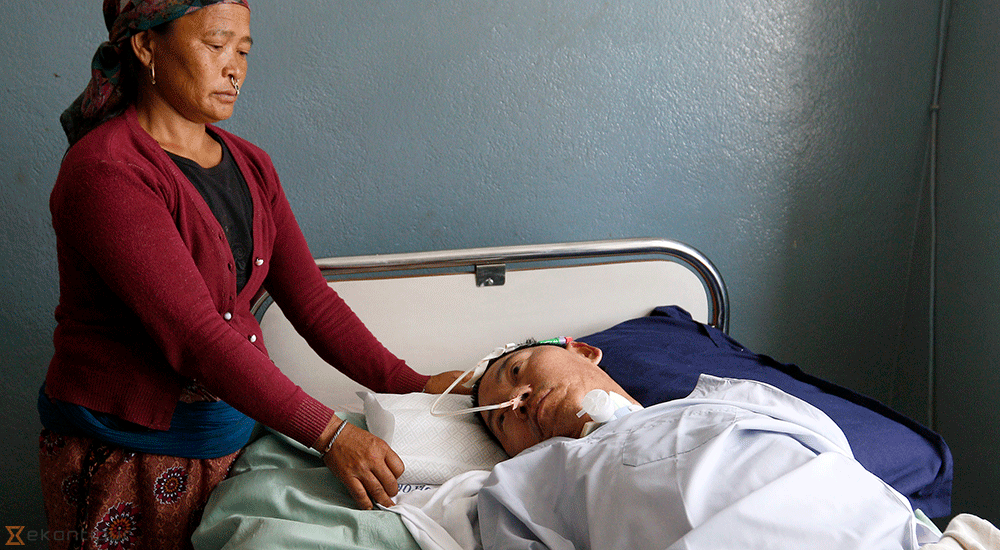 \"30062016075730Kalu_Gurung_03-1000x0\" काठमाडौं, १६ असार । ग्लोबल अस्पतालको कोठा नम्बर २ मा आफ्ना पति कालुको अनुहार हेर्दा हेर्दै बेलगानी गुरुङको आँखा रसाएर आयो । रुँदारुँदै थाकेजस्तो देखिने उनले पतिलाई धेरै बेरसम्म बोलाइरहिन् । बदलामा उनका पतिले सुस्तरी टाउको मात्रै दायाँबायाँ गरिरहे । आँखाको भाकाले चिनेजस्तो गरे, त्यसपछि कोल्टे फर्किरहे । आजको कान्तिपुर दैनिकमा खबर छ – आफ्नो लोग्नेलाई ज्युँदै देख्न पाउँदा खुसी हुनुपर्ने हो कि दुःखी ? बेलगानीले केही खुट्याउन सकिनन् । खुसी भइन् किनकि, चार वर्ष कतारको हमाद अस्पतालको कोमामा बसेका श्रीमान फर्केका छन् । दुःखी भइन् किनकि, ठमठम्ती हिँड्न र बोल्न पनि नसक्ने, प्रतिक्रिया जनाउन पनि नसक्ने, हात खुट्टा चलमलाउन पनि नसक्ने र ओछ्यानमै दिसापिसाब गर्ने अवस्थामा फर्केका छन् । बेलगानीले देब्रे नाडीले आँसु पुछदै भनिन्, ‘के खुसी के दुस्खी ?’ २०६८ साउन १ मा कतार पुगेका कालु काम थालेको चार महिनापछि नै अस्पतालको कोमामा पुगेका थिए । के कस्तो दुर्घटनामा परेर उनी अस्पताल पुगेका हुन्, परिवारका सदस्यलाई अहिलेसम्म थाहा छैन् । तर अस्पताल पुगेपछि उनको होस कहिल्यै फर्केन । बिरामीको स्वास्थ्यमा सुधार नभएको तर अवस्था स्थिर रहेपछि अस्पतालले केही महिनायता कतारस्थित नेपाली दूतावासलाई आफ्ना नागरिक स्वदेश फर्काउन दबाब दिइरहेको थियो । हमाद अस्पतालमा कालुजस्तै अचेत अवस्थामा रहेको अन्य एक दर्जनभन्दा धेरै बिरामीलाई अस्पताल प्रशासनले नेपाल फर्काउन खोजिरहेको छ । कालुसँगै बाँकेका हरिबहादुर बस्नेतलाई पनि अस्पतालले मंगलबार फर्काएको हो । कालुका छोरा वीरबल, दुई दिदी र आमा कोमाबाट फर्केका कालुलाई लिन गोरखा सौरपानी–७ बाट काठमाडौं आएका छन् । विमानस्थलमा बालाई देख्दा आमाले मन थाम्न नसक्लिन् भनेर वीरबलले आमालाई एकैचोटि अस्पताल लिएर गए । दुर्घटनाको पाँच महिनापछि मात्रै खबर पाएकी बेलगानीले भनिन्, ‘अब मेरो बुढा के हुन्छ ? सन्चो हुन्छ कि यस्तै हो ?’ पराई भूमिमा लोग्ने अचेत भएको खबर पाएपछि क्रिश्चियन धर्म मान्ने बेलगानीले चर्चमा गएर कैयनपटक प्रार्थना गरिन् । सपनामा पनि उनी ठमठम्ती हिँडेको लोग्नेलाई देख्थिन् । त्यतिबेला लाग्थ्यो, बुढा पक्कै सन्चो भएर आउँछन् । काठमाडौंमा राखेर उपचार गर्न सक्ने आर्थिक हैसियत उनको छैन । बेलगानीले भनिन्, ‘अब केही दिन अस्पताल राखेर घरै लैजान्छौं । जे होला घरमै होला ।’ गोरखाको सदरमुकामबाट पाँच घण्टा गाडी र एक घण्टा हिँडेपछि मात्रै कालुको घर पुगिन्छ । हरिबहादुर बस्नेत कालुसँगै आएका बर्दियाका हरिबहादुर बस्नेत पनि सोही अस्पतालको एक नम्बर कोठामा अचेत छन् । कालुको जस्तै उनी पनि बोल्न, प्रतिक्रिया जनाउन सक्दैनन् । कालुको जस्त