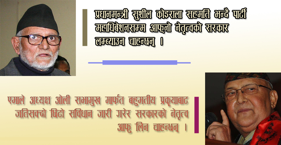 तर, एमाले अध्यक्ष केपी ओली लामो समयसम्म संविधासनभा स्थगित गरिए पनि एमाओवादीले जातीय राज्य बनाउनै पर्ने दबाब दिएको भन्दै प्रक्रियाबाटै संविधानको छिनोफानोमा पुगेका छन् । एमालेसँग मिलेर अघि बढाइएको प्रक्रिया संविधानसभा स्थगित अनिश्चितकालका राकिएको छ । साथै, कांग्रेस केन्द्रीय समितिबाट सहमतिका आधारमा संविधान बनाउने निर्णय आएपछि सत्ता सहयोगी दल एमाले झन् झस्किएको छ ।