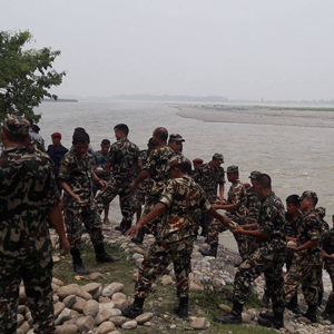 \"sena\"कञ्चनपुरको दोधारा चादँनी–४ स्थित महाकाली नदीले भत्काउन लागेको तटवन्ध बनाउँदै नेपाली सेनाको सिंहसार्दुल गुल्म भगतपुर ब्यारेकका टोली । तस्बिर ःशेरबहादुर सिंह, कञ्चनपुर, रासस