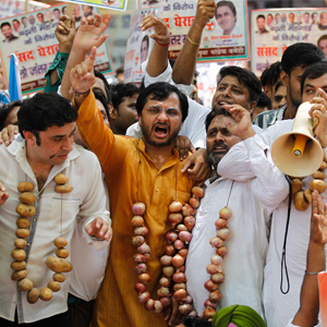 \"protest\"भारतीय प्रतिपक्षी दल कांग्रेस पार्टीको आयोजनामा दैनिक उपभोग्य समाग्रीमा भएको मूल्य वृद्धि विरुद्ध तरकारीले बनाएको माला लगाएर भारतको संसद भवन अगाडी प्रर्दशन गर्दै । तस्विरः एपी