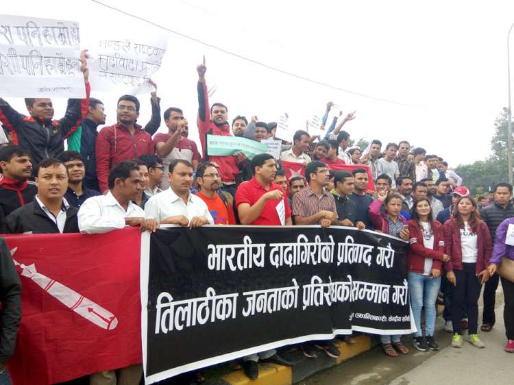 \"tilathi_krantikariकाठमाडौं, १५ साउन । सप्तरीको तिलाठीमा भारतीय पक्षले दशगजा क्षेत्रमा एकातर्फीरुपमा बाँध बाँधेपछि स्थानिय नेपालीले बाँध भत्काइदिएका थिए । बाँध भत्काउने क्रममा नेपाली भारतीयहरुबिच झडप समेत भएको थियो । सोही घटनाको समर्थन गर्दै नेकपा माओवादी निकट अखिल क्रन्तिकारीले शनिबार विहान माइतिघर मण्डलामा ‘राष्ट्रियताको पक्षमा लड्ने सप्तरी बासीलाई सलाम’ सहितको प्लेकार्ड बोकेर प्रदर्शन गरेको हो । मण्डले राष्ट्रवादको ठाउँमा वास्तविक राष्ट्रवादी ति तिलाठीका जनता रहेको समेत क्रान्तिकारीले बताएको छ । नेकपा माओवादी केन्द्रका नेता तथा विद्यार्थी आन्दोलनका पूर्व नेताहरु लेखनाथ न्यौपाने,युवराज चौलागाई, रमेश मल्ल तथा रत्न ढकालहरुको उपस्थितिमा भएको उक्त प्रदर्शनमा अखिल क्रन्तिकारीको संयोजक नरेन्द्र न्यौपाने पनि सम्बोधन गरेका थिए । ‘भारतीय दादागिरिको प्रतिरोध गरौ, तिलाठीका जनताको प्रतिरोधको सम्मान गरौ !’ भन्ने मुल व्यानरसहित भएको प्रदर्शनमा ‘तिलाठी हमान जनतालाई सम्मान गरौं’, ‘मधेस पनि हाम्रै हो, मधेसी पनि हाम्रै हुन्’ जस्ता लेखेका प्लेकार्ड बोकिएको थियो । \"tilathi_krantikari \"tilathi_krantikari \"tilathi_krantikari \"tilathi_krantikari