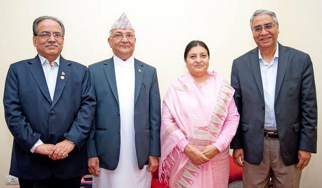 \"sitalकाठमाडौं, १६ साउन । नयाँ सरकार गठनका बिषयमा राष्ट्रपति विद्यादेवी भण्डारी र तीन दलका शीर्ष नेताबीच भेटवार्ता भएको छ । प्रधानमन्त्री तथा एमाले अध्यक्ष केपी शर्मा ओली, नेपाली कांग्रेसका सभापति शेर बहादुर देउवा , र नेकपा माओवादी केन्द्रका अध्यक्ष पुष्पकमल दाहाल ‘प्रचण्ड’लाई शितल निवासमै बोलाएर राष्ट्रपति भण्डारीले भेटवार्ता गरेकी हुन । दलहरुको बीचमा सहमतिय आधारमा सरकार गठनको समय सीमा आज सकिँदै गर्दा राष्ट्रपति भण्डारी र तीन दलका शीर्ष नेताहरु बीच भेटबार्ता भएको हो । सहमतिको आधारमा सरकार गठनका लागि राष्ट्रपतिले सात दिनको समय दिएता पनि दलहरुको बीचमा सहमतिय सरकार गठन गर्ने विषयमा सहमति जुट्न सकेको छैन ।