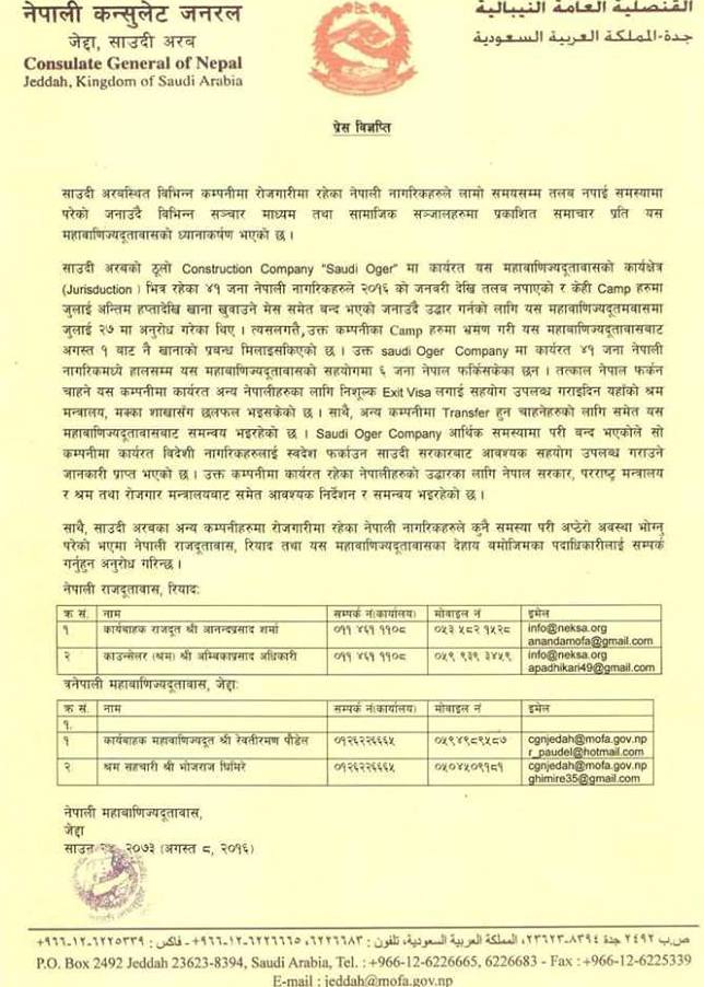 \"bigapti\"काठमाडौं, २५ साउन । विदेशमा अलपत्र परेका कामदारहरुको तत्काल उद्धार गर्न प्रधानमन्त्री प्रचण्डको निर्देशन पश्चात साउदी अरब स्थित नेपली महावाणिज्य दुतले साउदीमा कार्यरत नेपाली कामदारहरुको अवस्थाको बारेमा स्पष्ट पारेको छ । साउदी अरबका विभिन्न कम्पनीमा कार्यरत नेपाली कामदारहरुले लामो समय देखि तलब नपाई राखेको अवस्था बारे आफुनो ध्यान आकर्षण भएको जनाउँदै साउदी स्थित महावाणिज्य दुतले नेपाली कामदारहरुको अवस्थाको बारेमा जानकारी गराउन विज्ञप्ति जारी गरेको हो । साउदी अरेयिबाकै सवैभन्दा ठुलो कम्पनी ‘साउदी ओगर’ मा कार्यरत ४१ जना नेपाली कामदारले जनावरी २०१६ देखि तलब नपाएको भन्दै र खानाको मेस बन्द गरिएको भन्दै उद्धारका लागि उजुरी गरेका थिए । अगस्ट १ बाटै खानाको प्रबन्ध मिलाएको र तलब नपाएका ४१ कामदारमध्ये ६ जनालाई नेपाल नै फर्काइसकिएको महावाणिज्यदूतावासले स्पष्ट पारेको छ । समस्यामा परेका नेपालीले घर फर्कन चाहे निशुल्क ’एक्जिट भिसा’ उपलब्ध गराउने विषयमा छलफल भइरहेको दुताबासले जनाएको छ । ओगर कम्पनी आर्थिक समस्याका कारण बन्द भएकाले साउदी सरकारले समेत त्यहाँ कार्यरत कामदारलाई स्वदेश फर्काउन सहयोग उपलब्ध गराउने बताइसकेको दुताबासको विज्ञप्तिमा जनाइएको छ । साउदीमा रहेका कम्पनीहरु आर्थिक संकटका कारण बन्द भएपछि अन्य देशबार त्यहाँ काम गर्न जाने कामदारहरुले निकै सम्मस्या भोग्नु परिरहेको छ । सोमबार प्रधानमन्त्री प्रचण्डले साउदी अरब, श्रीलंका लगायतका मुलुकमा समस्यामा परेका नेपाली कामदारको उद्धारका लागि परराष्ट्र सचिवलाई निर्देशन दिएका थिए । जवाफमा परराष्ट्र सचिव शंकरदास वैरागीले प्रधानमन्त्रीको निर्देशन तुरुन्त कार्यन्वयन गर्ने बताएका थिए ।