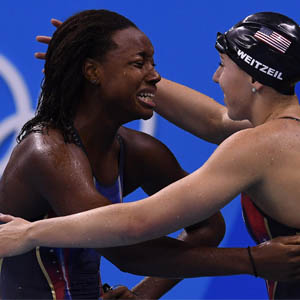 \"swimming\"रियो ओलम्पिकमा १०० मिटार पौडी प्रतियोगितामा विजयी अमेरिकी पौडिवाज सिमोनी म्यानुयललाई अर्की प्रतियोगी एबी वेटजेलीले बधाई दिँदै । तस्विरः एएफपी