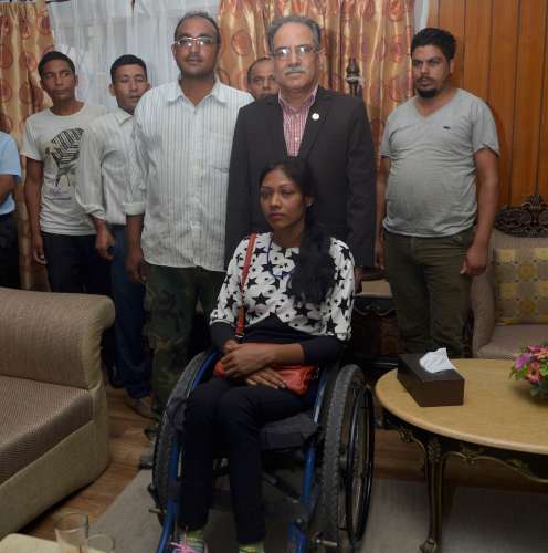 \"prachanda_ghaite-500\"काठमाडौं, ९ भदौ । पूर्व जनमुक्ति सेनाका घाइते, अपाङ्ग योद्धाहरुको टोलीले प्रधानमन्त्री पुष्पकमल दाहाल ‘प्रचण्ड’सँग भेट गरेका छन् । बिहीबार बिहान प्रधानमन्त्री निवास बालुवाटारमा भएको भेटमा घाइते, अपाङ्ग योद्धाका प्रतिनिधिहरुले आफ्ना समस्याबारे प्रधानमन्त्रीको ध्यानाकर्षण गराएका छन् । टोलीले युद्धका घाइतेहरुको अझै उचित उपचार हुन नसकेको, जीवन निर्वाह भत्ता अत्यन्तै न्यून भएको तथा राष्ट्रका लागि योगदान गरेको पहिचान सहितको परिचय पत्रको व्यवस्था नगरिएको भन्दै प्रधानमन्त्रीको ध्यानाकर्षण गराएका थिए । भेटमा प्रधानमन्त्रीले ‘घाइते योद्धाहरुको निशूल्क उपचारको व्यवस्था मिलाउने, जीवन निर्वाह भत्ता वृद्धि गर्न पहल गर्ने तथा राष्ट्रिय परिचय पत्रको व्यवस्था गर्ने’ बताएका छन् ।