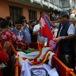 सूचना तथा सञ्चारमन्त्री सुरेन्द्रकुमार कार्की आइतबार प्रज्ञा प्रतिठानमा गायक स्व खेमराज गुरुङको पार्थिक शरीरमा राष्ट्रिय झण्डा ओडाएर श्रद्धान्जलि व्यक्त गर्दै । तस्बिर : रोशन सापकोटा, रासस \"sradanjali\"