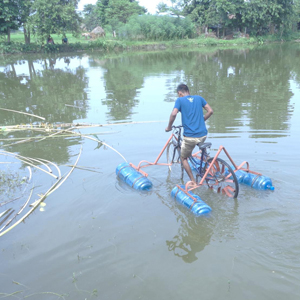 \"cycle\"मोरङको हाथिमुडामा रहेको मनमोहन पोलीटेक्नीकल कजेलका विद्यार्थीले बनाएको पानीमाथि कुद्ने साइकल कुदाउँदै एक विद्यार्थी । तस्बिर ः गोपालप्रसाद पोखरेल, रासस
